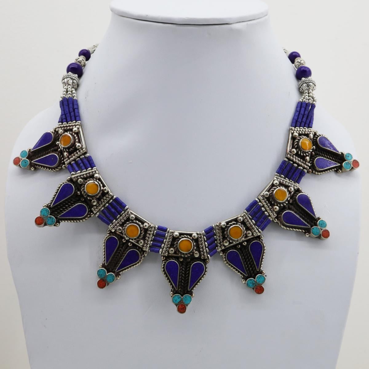 Tibet Natural Stone Hand Made Turquoise, Coral & lapiz Lazuli Necklace......;This elegant large Necklace was handcrafted in Tibet, the home of exquisite jewelry craftsmanship. It was skillfully made with large natural Turquoise, each in a deep Tibetan Silver setting. and balance the design perfectly. Turquoise is used virtually worldwide for jewelry making, and is highly prized for its brilliant colors, which vary from mine to mine. The distinctive webbing patterns and variations of color in the stones on this wonderful piece are typical of the natural Turquoise found throughout much of the Himalayan region, where Turquoise has been used in jewelry-making since centuries.