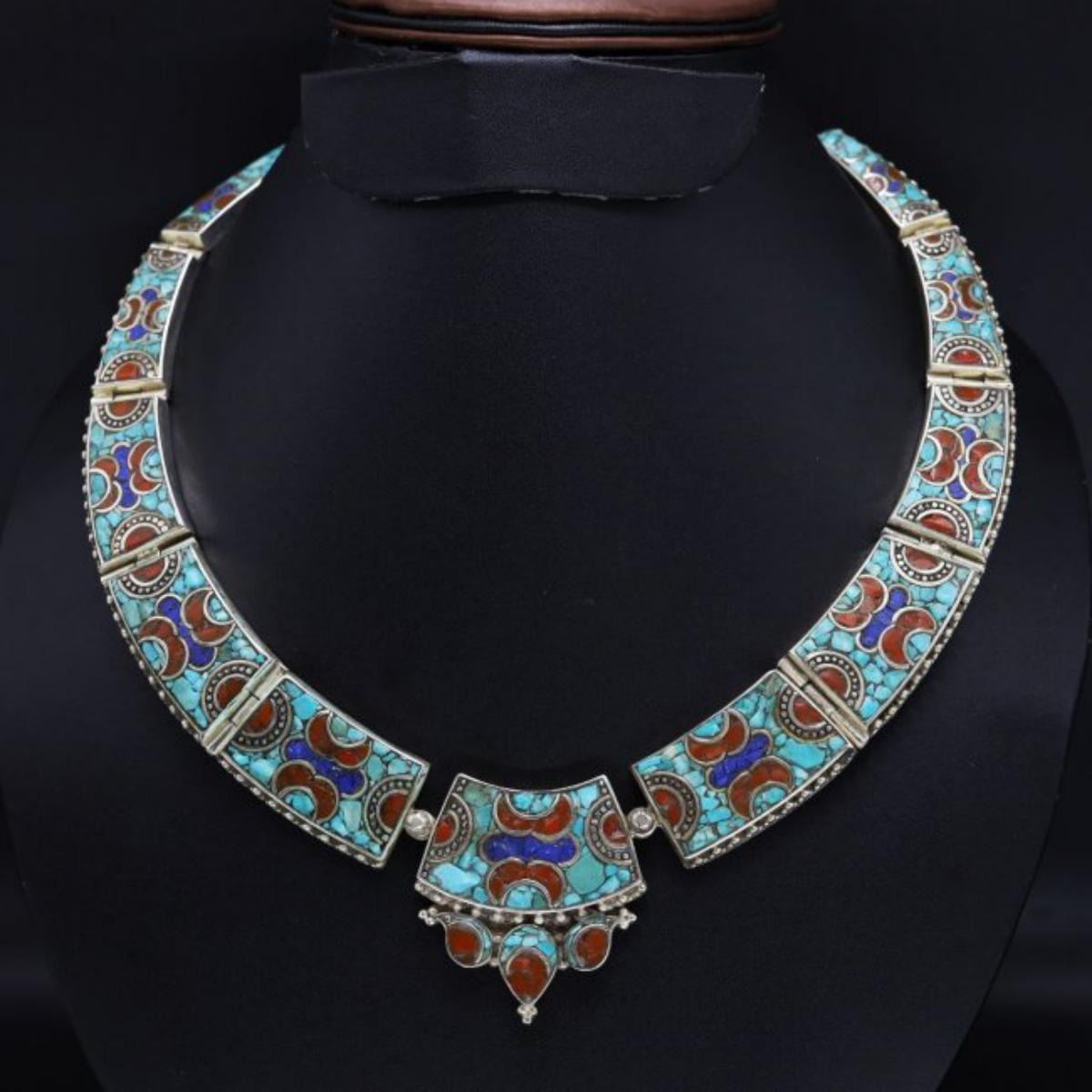 Tibet Natural Stone Hand Made Turquoise,Lapiz lazuli & Coral Necklace......;This elegant large Necklace was handcrafted in Tibet, the home of exquisite jewelry craftsmanship. It was skillfully made with large natural Turquoise, each in a deep Tibetan Silver setting. and balance the design perfectly. Turquoise is used virtually worldwide for jewelry making, and is highly prized for its brilliant colors, which vary from mine to mine. The distinctive webbing patterns and variations of color in the stones on this wonderful piece are typical of the natural Turquoise found throughout much of the Himalayan region, where Turquoise has been used in jewelry-making since centuries.