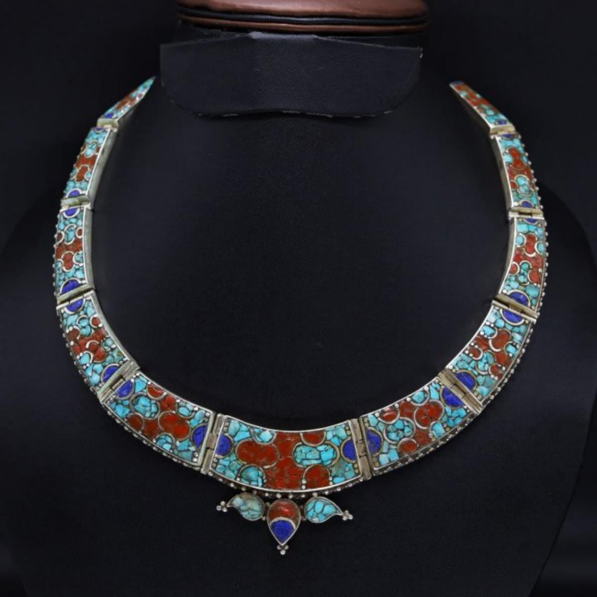 Tibet Natural Stone Hand Made Turquoise,Lapiz lazuli & Coral Necklace......;This elegant large Necklace was handcrafted in Tibet, the home of exquisite jewelry craftsmanship. It was skillfully made with large natural Turquoise, each in a deep Tibetan Silver setting. and balance the design perfectly. Turquoise is used virtually worldwide for jewelry making, and is highly prized for its brilliant colors, which vary from mine to mine. The distinctive webbing patterns and variations of color in the stones on this wonderful piece are typical of the natural Turquoise found throughout much of the Himalayan region, where Turquoise has been used in jewelry-making since centuries.