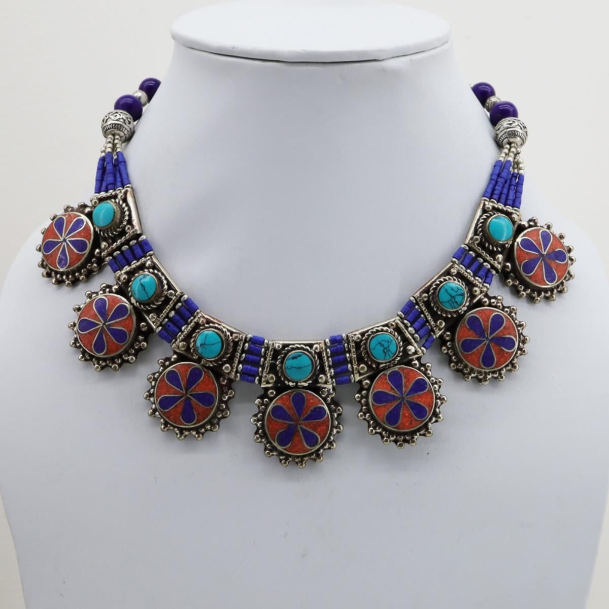 Tibet Natural Stone Hand Made Turquoise, Coral Necklace & Lapiz Lazuli.......This elegant large Necklace was handcrafted in Tibet, the home of exquisite jewelry craftsmanship. It was skillfully made with large natural Turquoise, each in a deep Tibetan Silver setting. and balance the design perfectly. Turquoise is used virtually worldwide for jewelry making, and is highly prized for its brilliant colors, which vary from mine to mine. The distinctive webbing patterns and variations of color in the stones on this wonderful piece are typical of the natural Turquoise found throughout much of the Himalayan region, where Turquoise has been used in jewelry-making since centuries.& rdquo;& rdquo;& rdquo;Note- All stones in this necklace are Natural.....Guaranteed....Vintage look but necklace is brand new.Note- (Handcrafted/Handmade in Tibet)