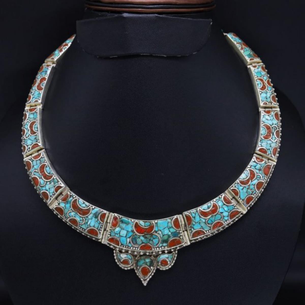 This elegant large Necklace was handcrafted in Tibet, the home of exquisite jewelry craftsmanship. It was skillfully made with large natural Turquoise, each in a deep Tibetan Silver setting. and balance the design perfectly. Turquoise is used virtually worldwide for jewelry making, and is highly prized for its brilliant colors, which vary from mine to mine. The distinctive webbing patterns and variations of color in the stones on this wonderful piece are typical of the natural Turquoise found throughout much of the Himalayan region, where Turquoise has been used in jewelry-making since centuries. All stones in this necklace are Natural.....Guaranteed....Vintage look but necklace is brand new.Note- (Handcrafted/Handmade in Tibet)