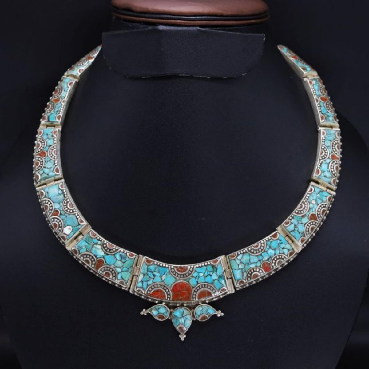 This elegant large Necklace was handcrafted in Tibet, the home of exquisite jewelry craftsmanship. It was skillfully made with large natural Turquoise, each in a deep Tibetan Silver setting. and balance the design perfectly. Turquoise is used virtually worldwide for jewelry making, and is highly prized for its brilliant colors, which vary from mine to mine. The distinctive webbing patterns and variations of color in the stones on this wonderful piece are typical of the natural Turquoise found throughout much of the Himalayan region, where Turquoise has been used in jewelry-making since centuries. All stones in this necklace are Natural.....Guaranteed....Vintage look but necklace is brand new.Note- (Handcrafted/Handmade in Tibet)