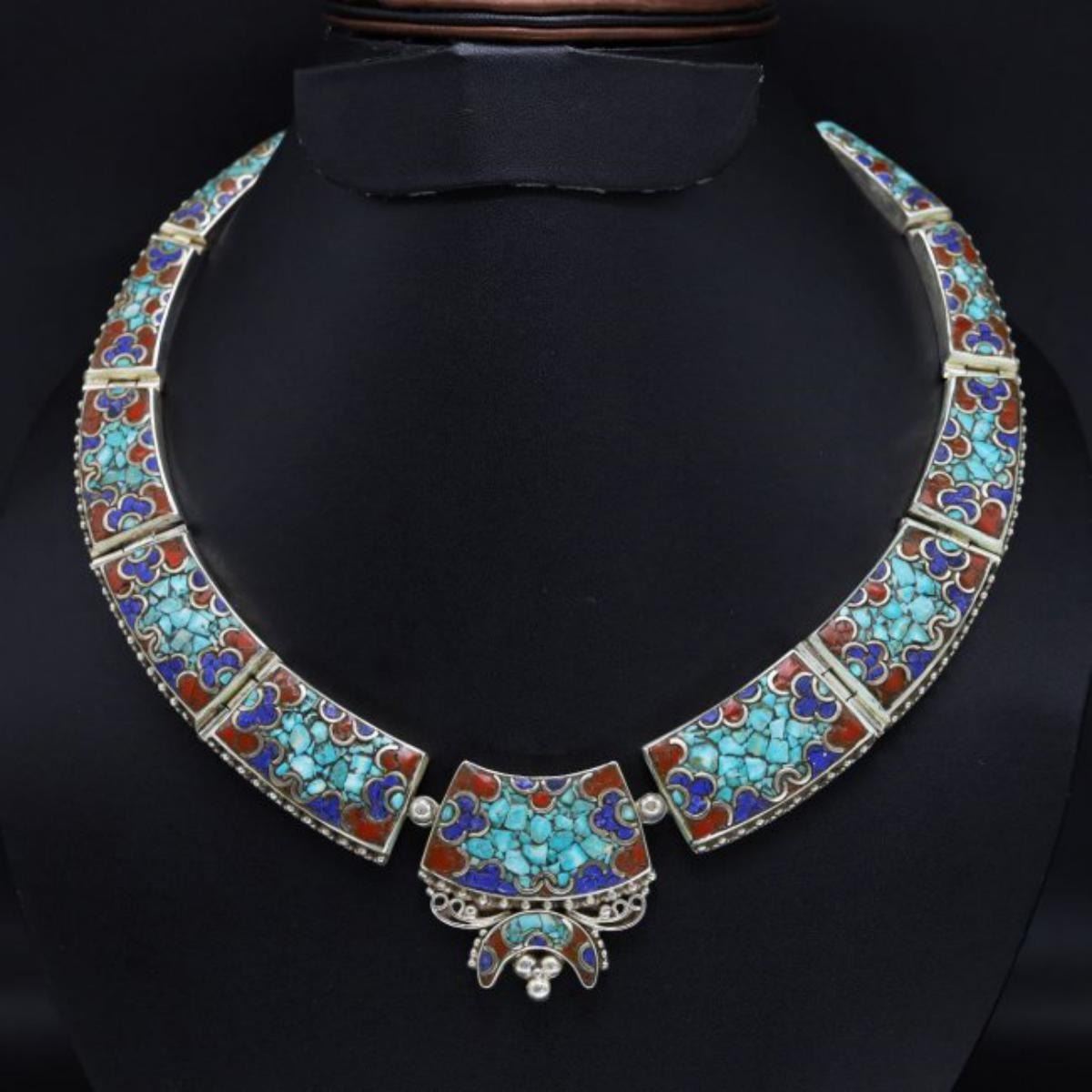 Tibet Natural Stone Hand Made Turquoise,Lapiz lazuli & Coral Necklace......;This elegant large Necklace was handcrafted in Tibet, the home of exquisite jewelry craftsmanship. It was skillfully made with large natural Turquoise, each in a deep Tibetan Silver setting. and balance the design perfectly. Turquoise is used virtually worldwide for jewelry making, and is highly prized for its brilliant colors, which vary from mine to mine. The distinctive webbing patterns and variations of color in the stones on this wonderful piece are typical of the natural Turquoise found throughout much of the Himalayan region, where Turquoise has been used in jewelry-making since centuries.