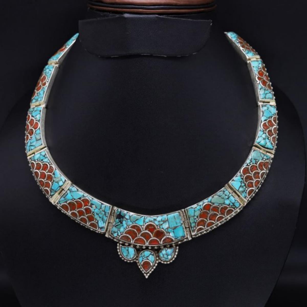 This elegant large Necklace was handcrafted in Tibet, the home of exquisite jewelry craftsmanship. It was skillfully made with large natural Turquoise, each in a deep Tibetan Silver setting. and balance the design perfectly. Turquoise is used virtually worldwide for jewelry making, and is highly prized for its brilliant colors, which vary from mine to mine. The distinctive webbing patterns and variations of color in the stones on this wonderful piece are typical of the natural Turquoise found throughout much of the Himalayan region, where Turquoise has been used in jewelry-making since centuries. All stones in this necklace are Natural.....Guaranteed....Vintage look but necklace is brand new.Note- (Handcrafted/Handmade in Tibet)