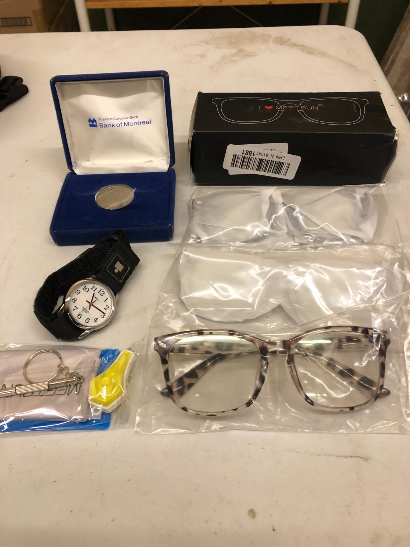 Time + wrist watch/1982 CND dollar coin & 3 pair of fashion eye glasses