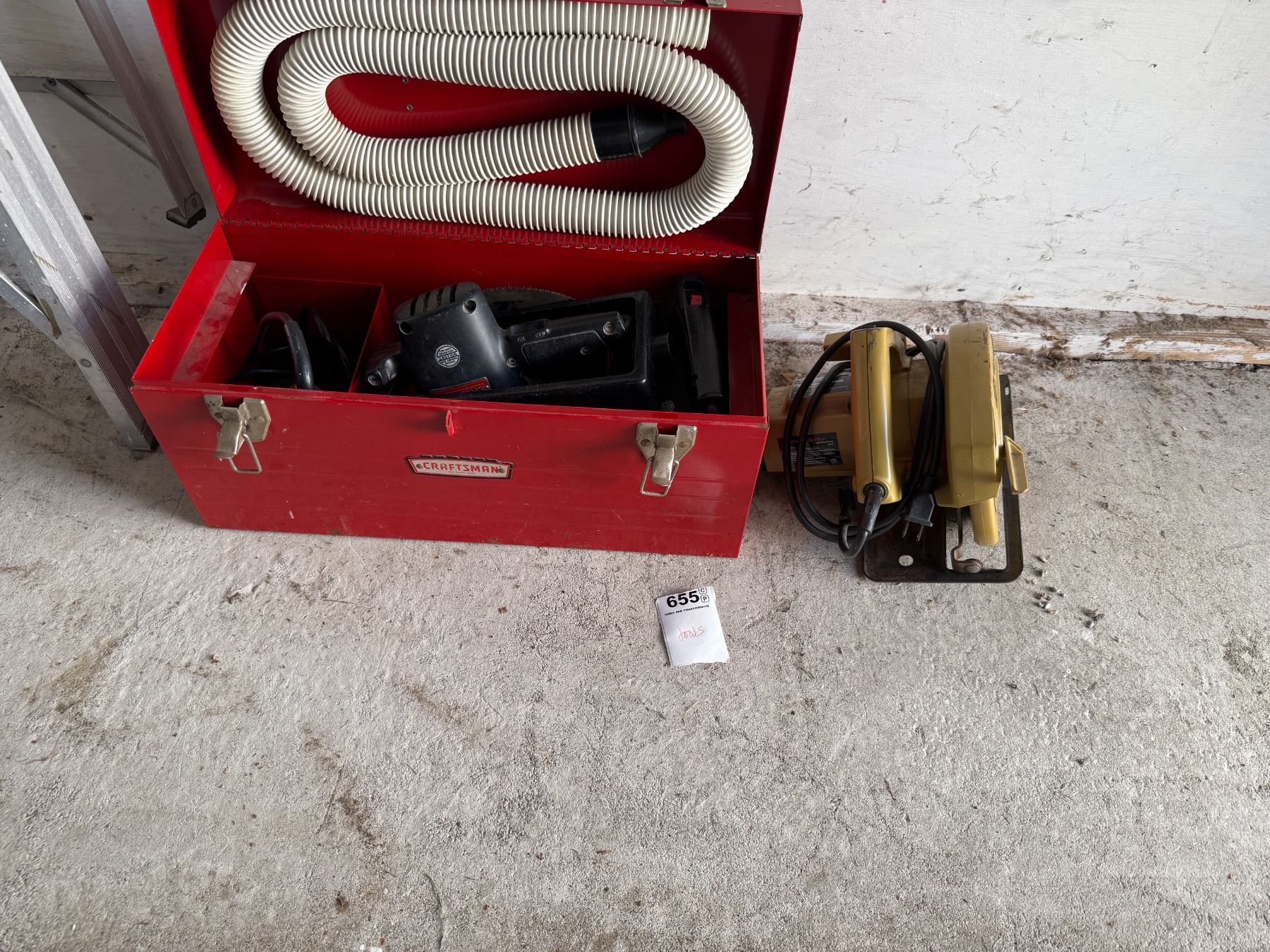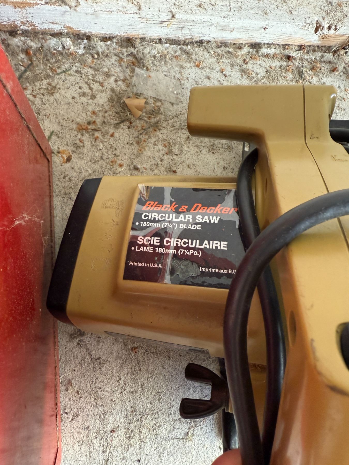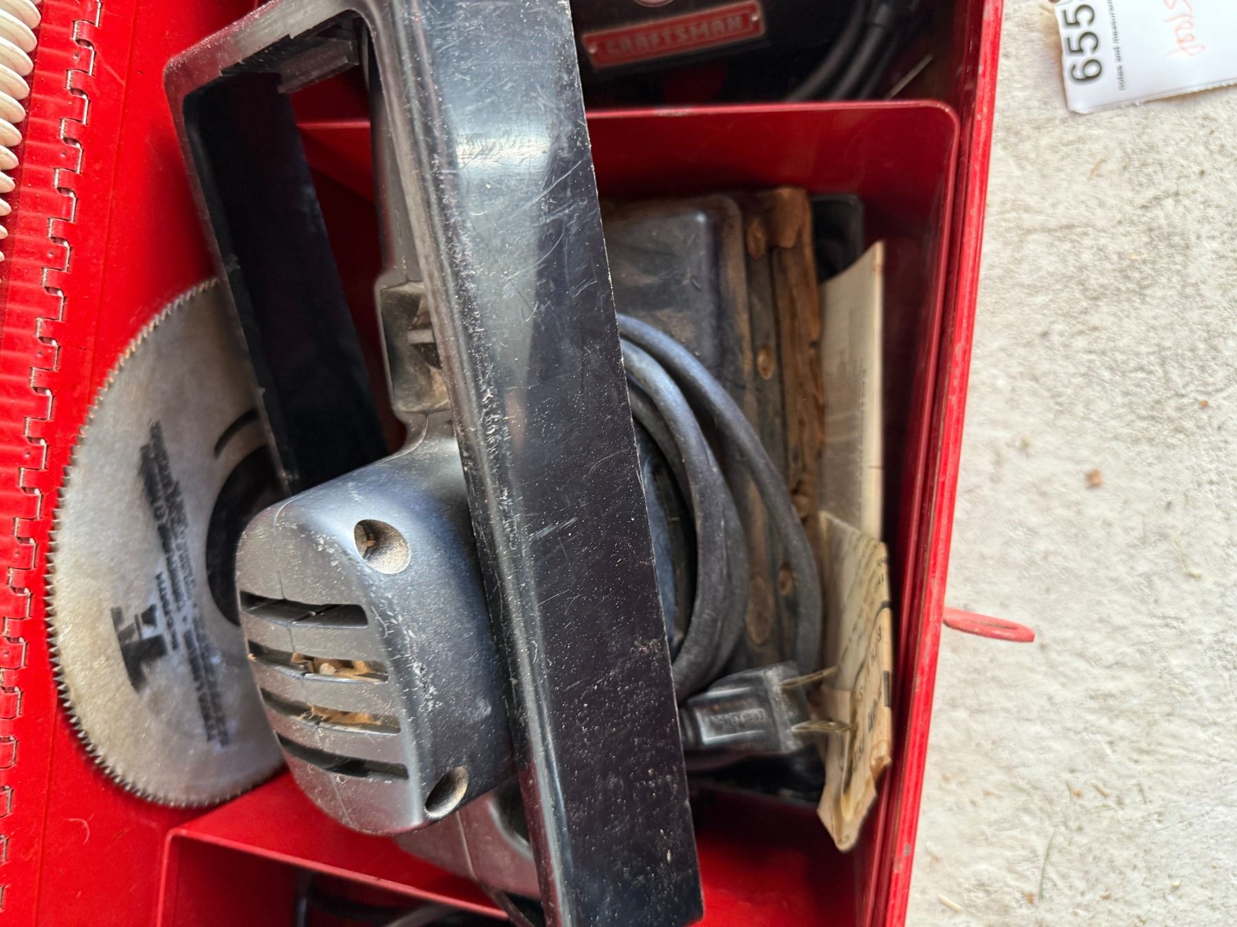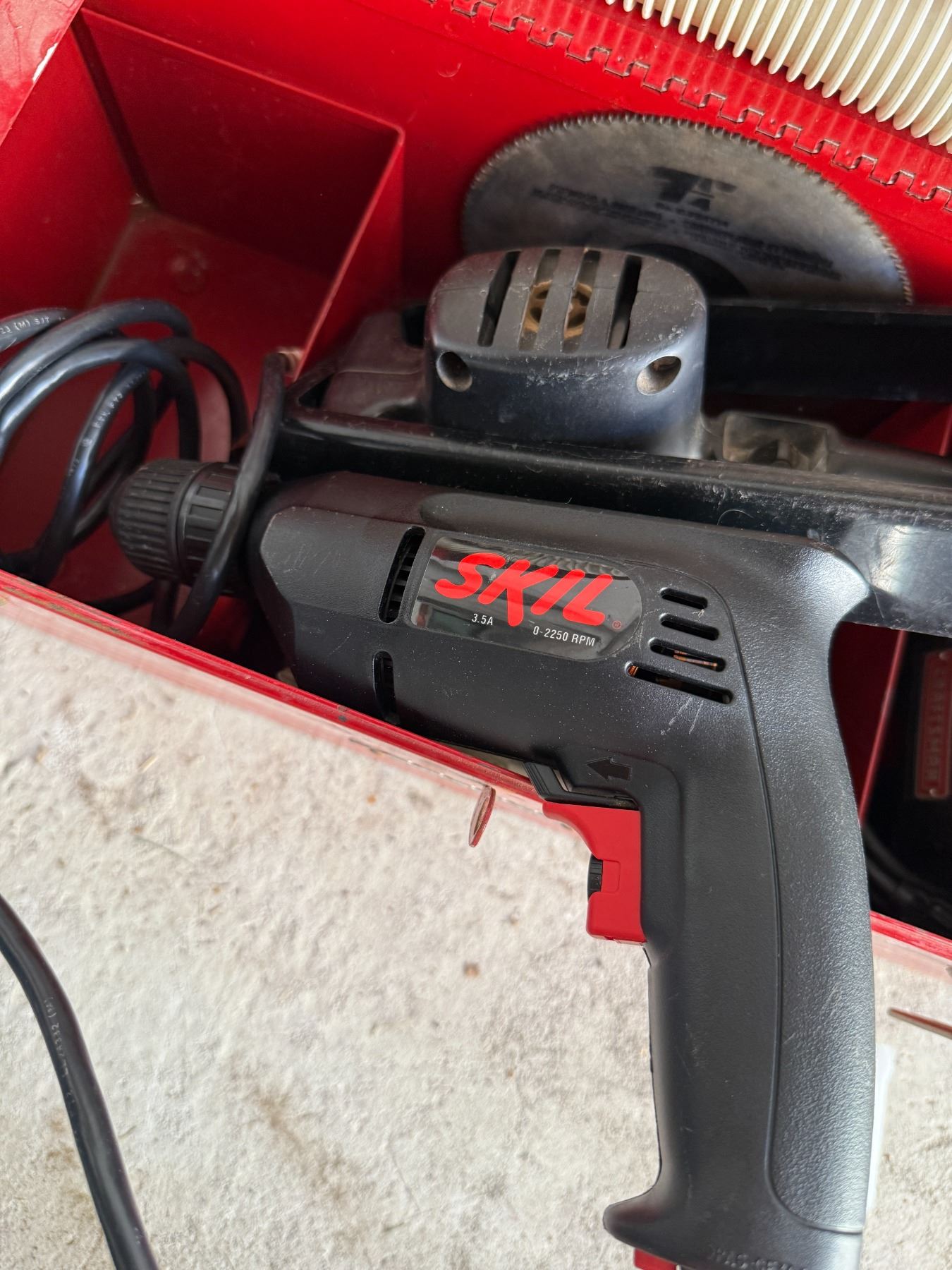 Craftsman metal toolbox, Skil 3.5A drill, Craftsman 1/2" saber saw, Black & Decker circular saw. All untested. As is. In garage.