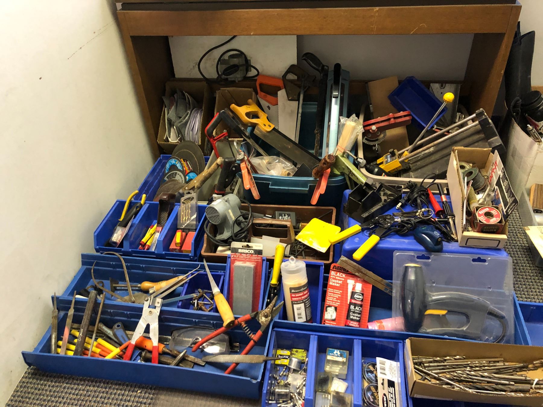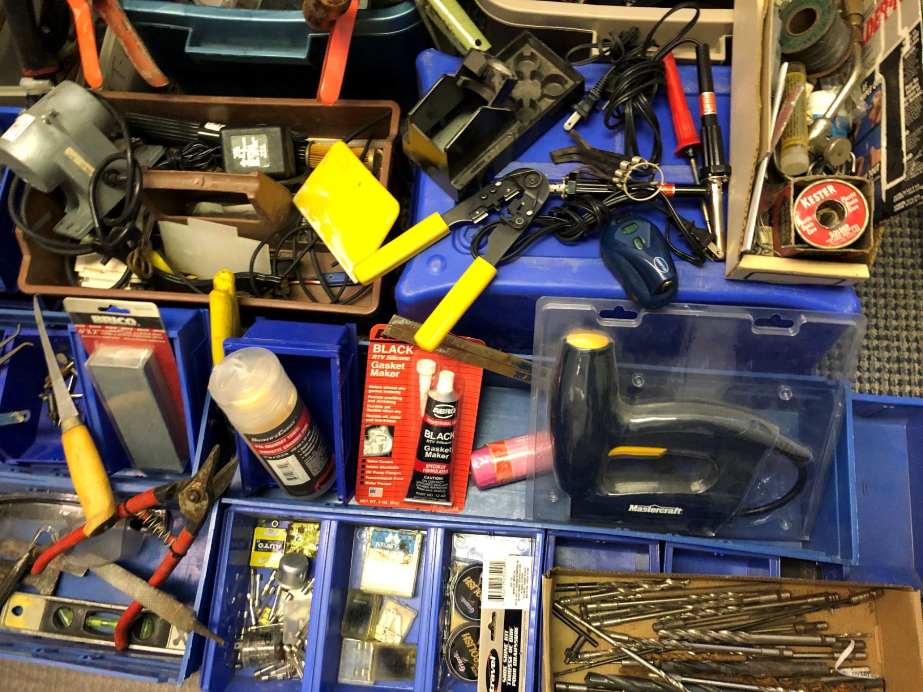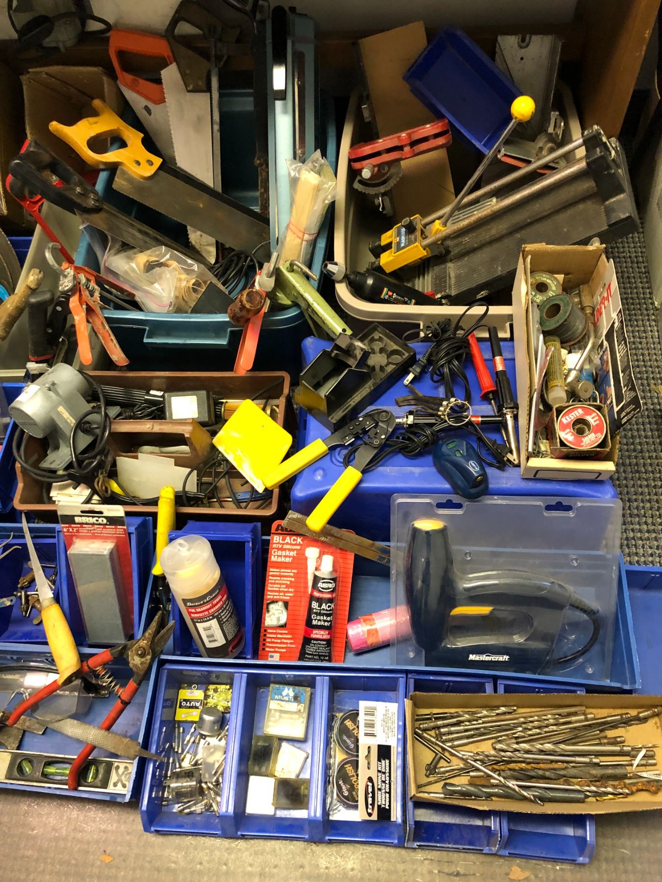 Large lot of tools including callipers, saws, cutters, bits, grinding disks, soldering supplies, electric nailer,