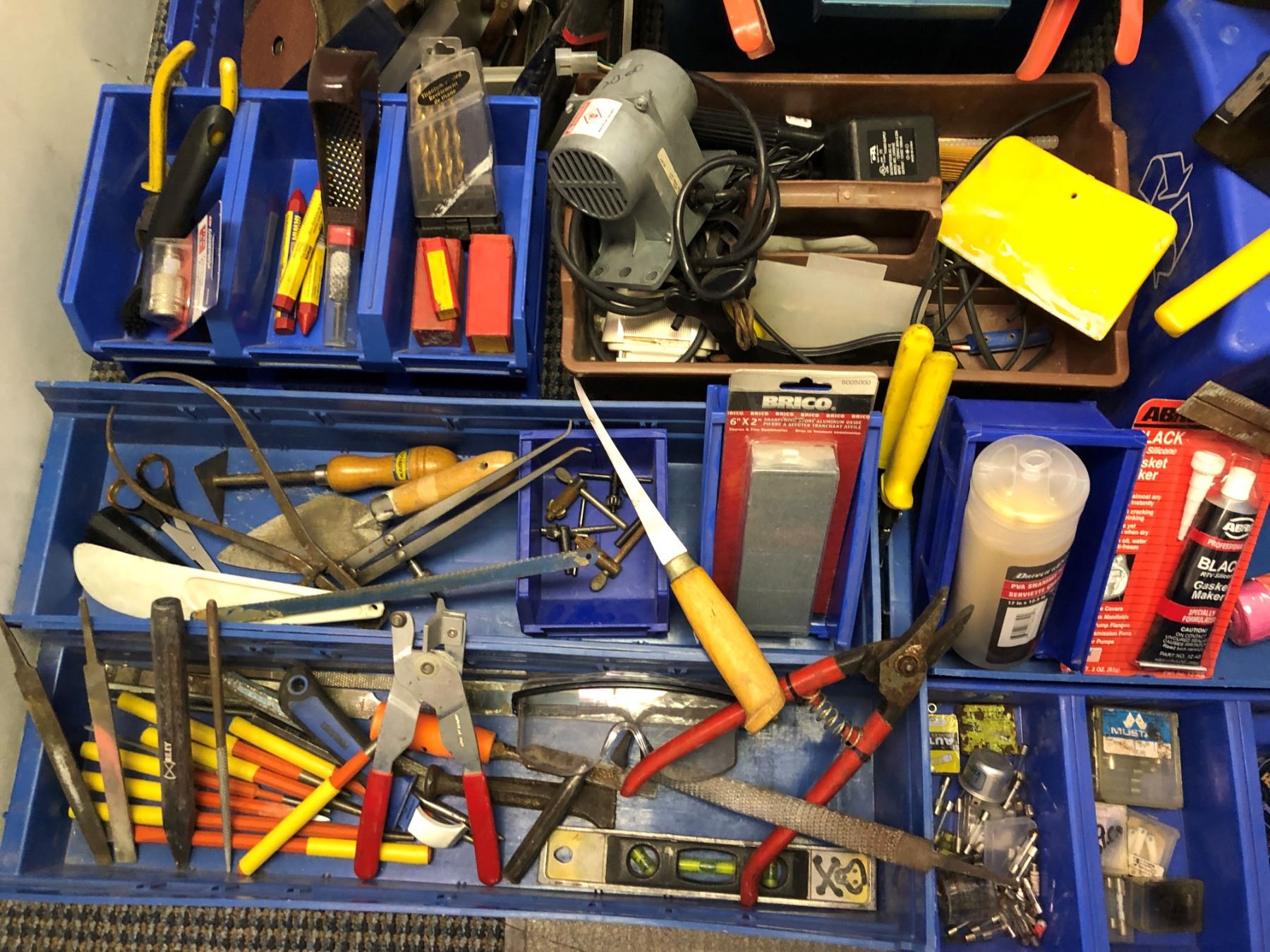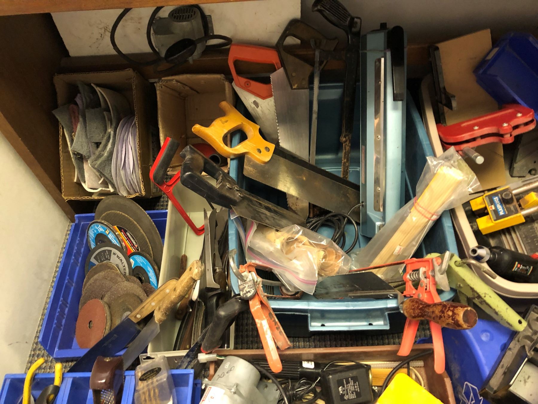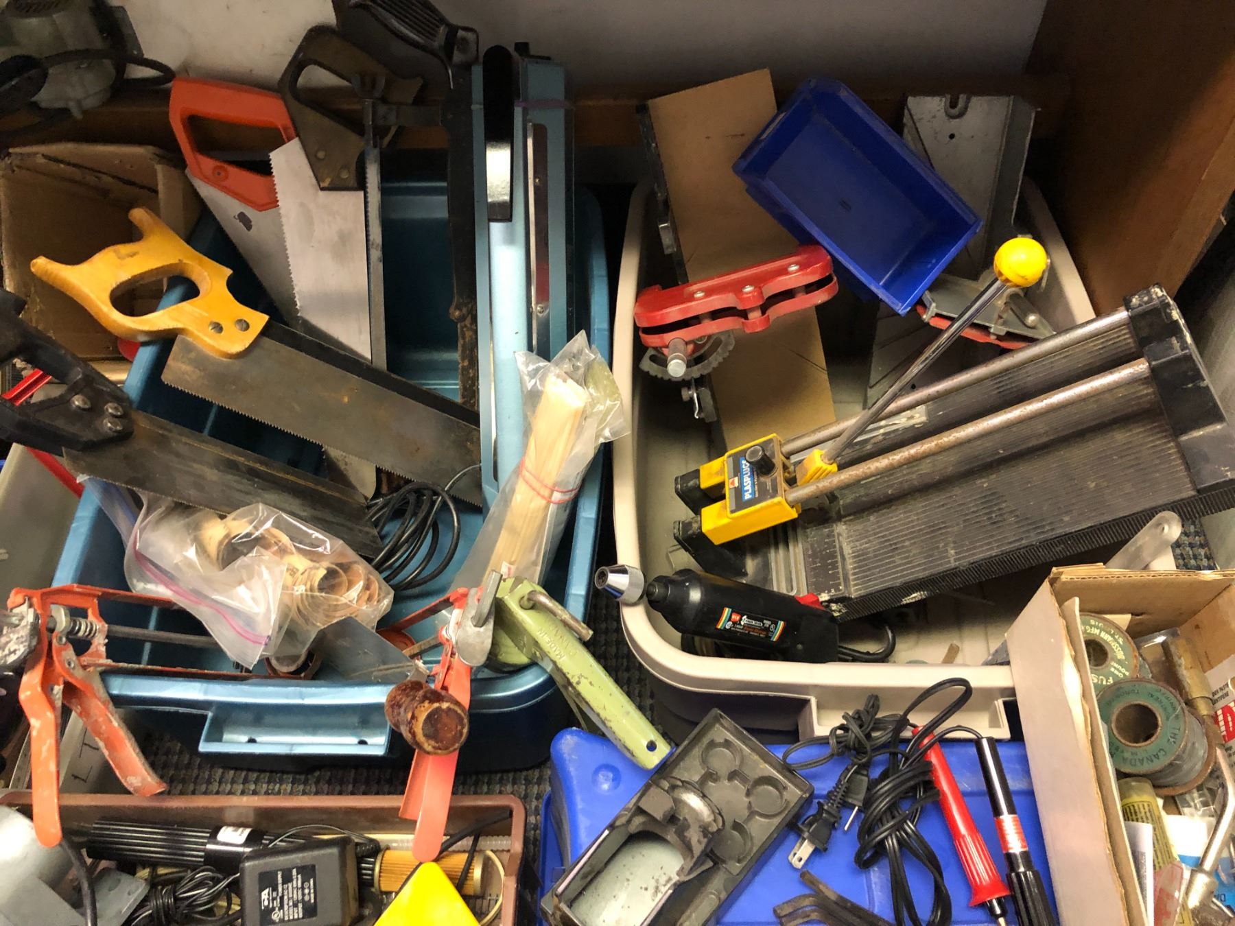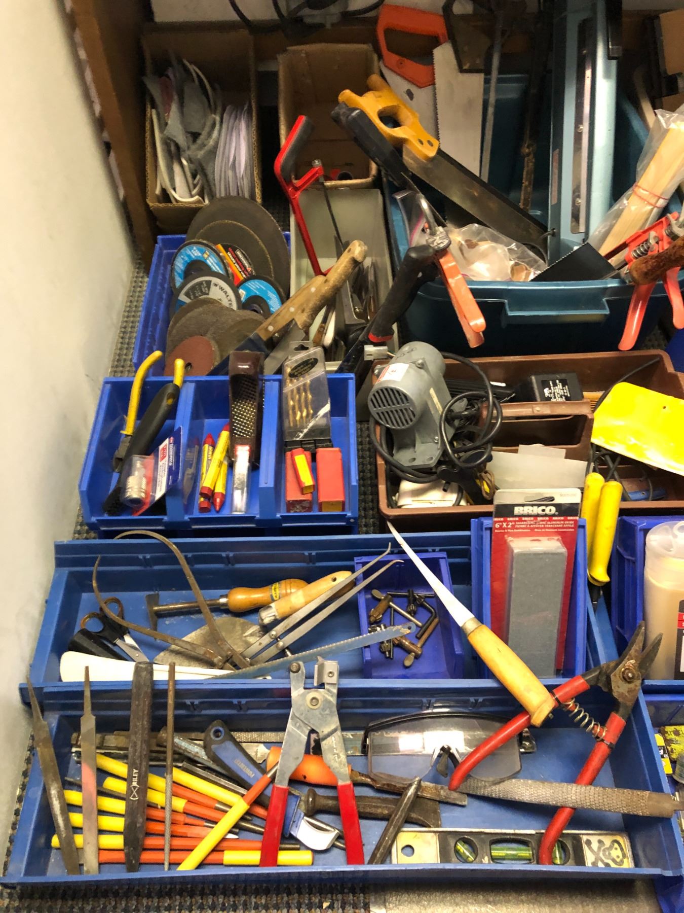 Large lot of tools including callipers, saws, cutters, bits, grinding disks, soldering supplies, electric nailer,