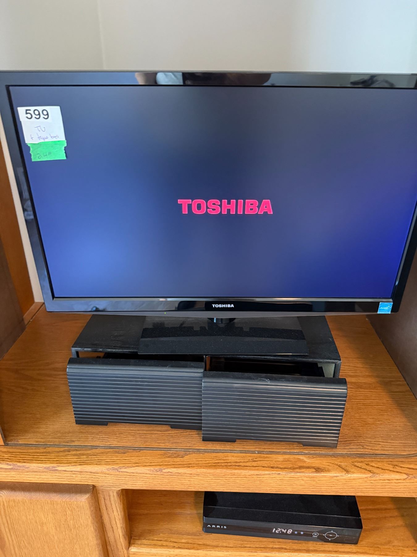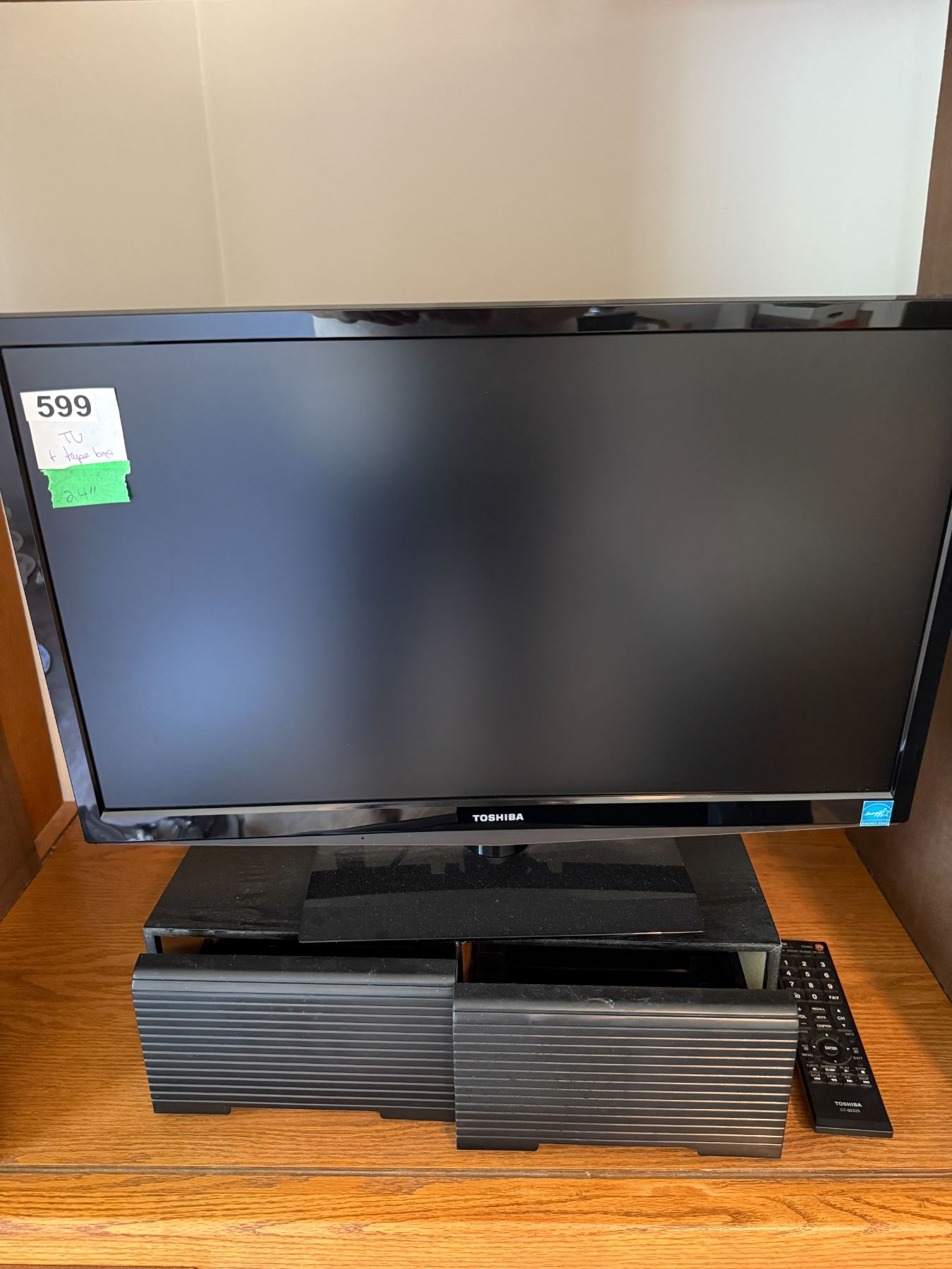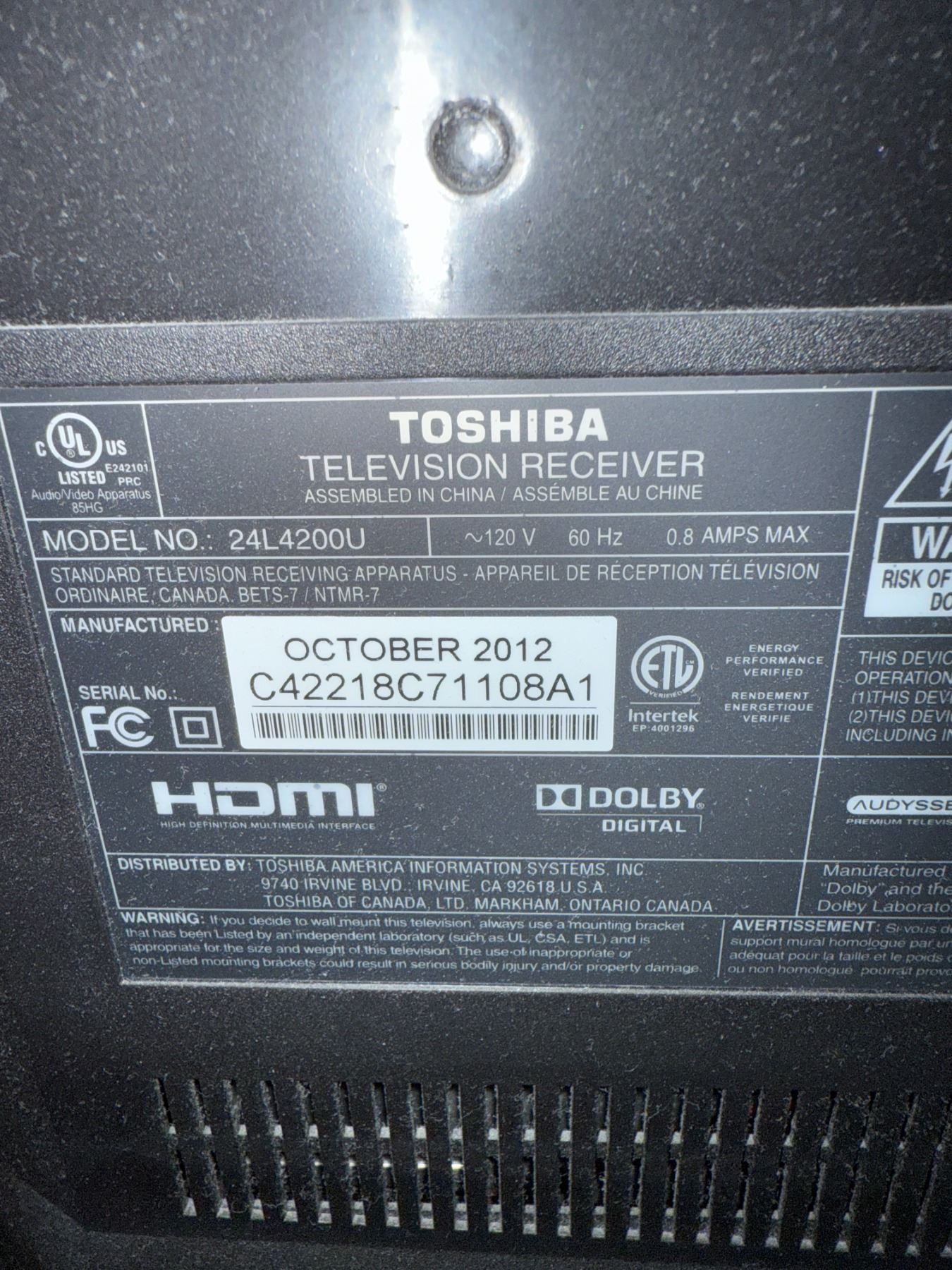 Toshiba 24" TV model 24L4200U and remote. Includes tape storage. In bedroom 2.