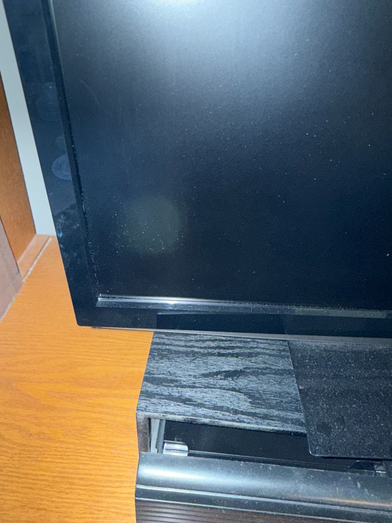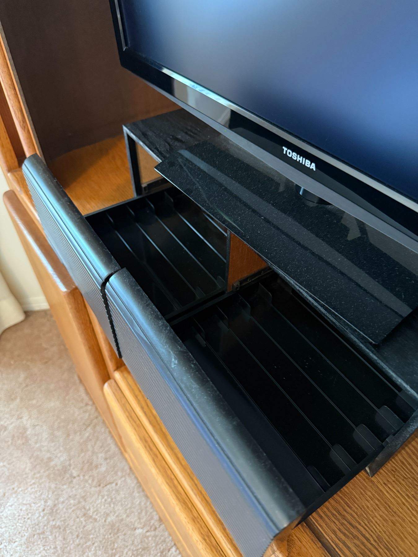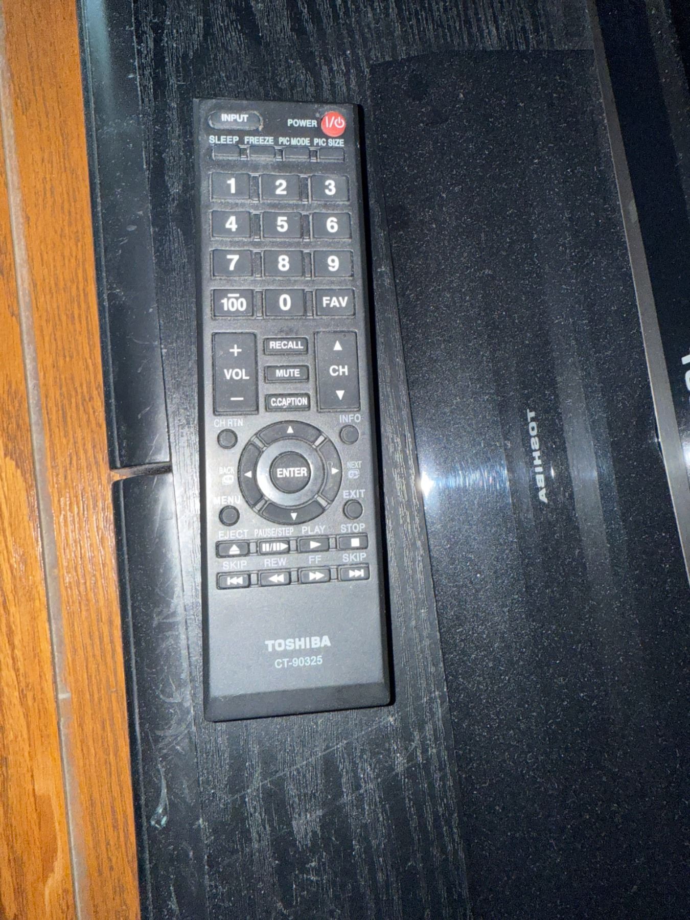 Toshiba 24" TV model 24L4200U and remote. Includes tape storage. In bedroom 2.