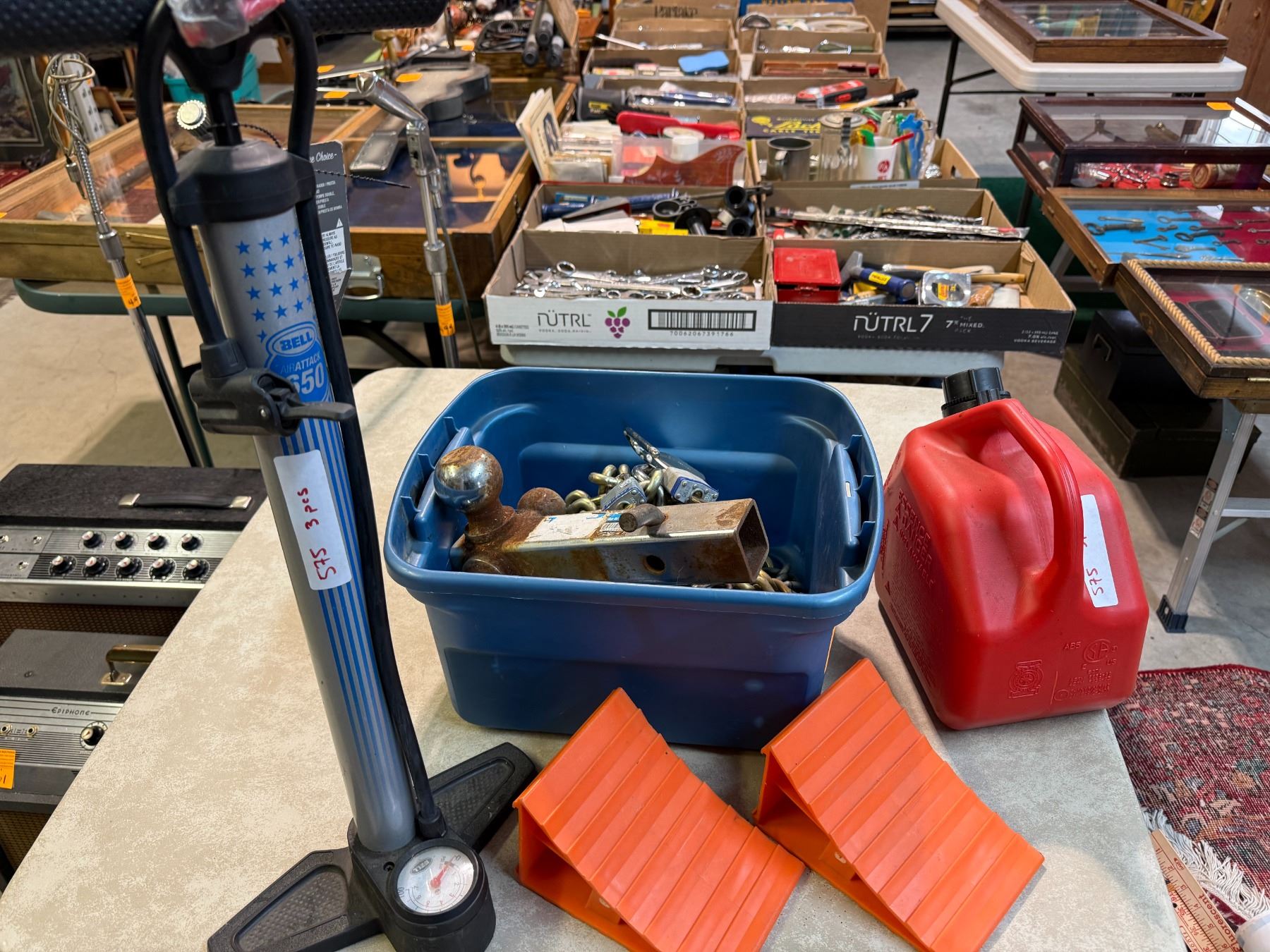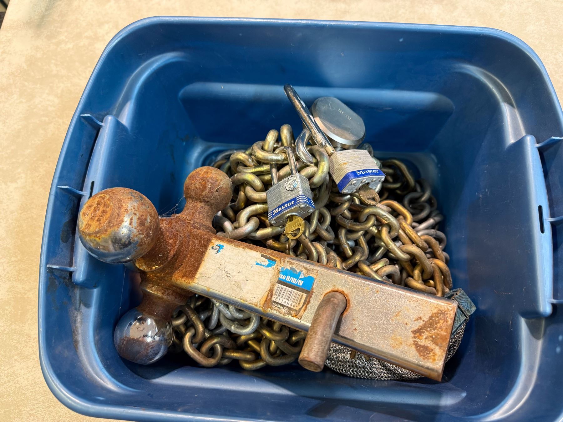 Tote Containing Tow Hitch, Chains, Master Padlocks, Wheel Chocks, 5L Jerry Can, and New Bike Pump wi