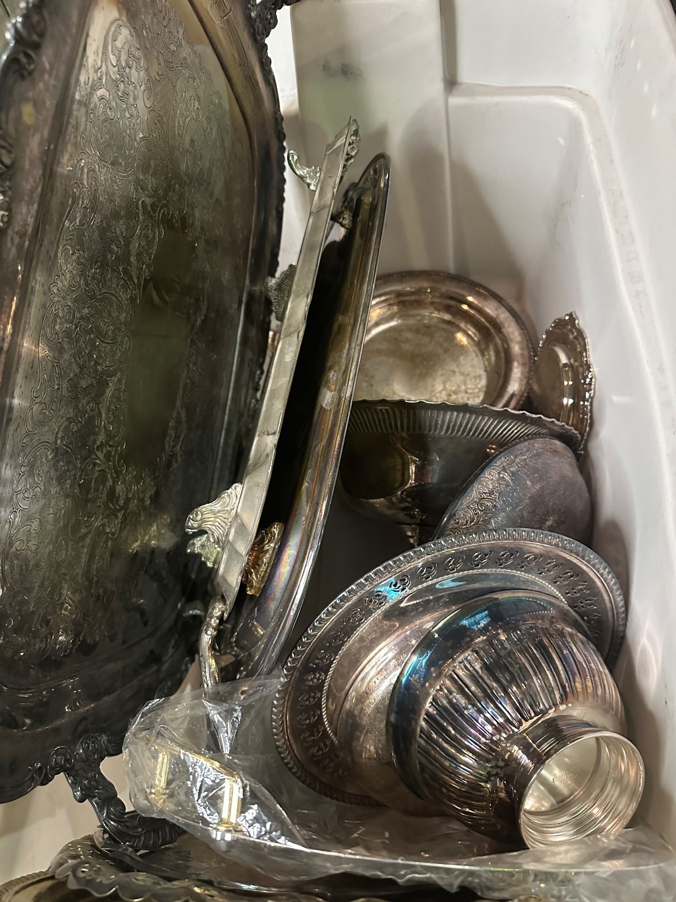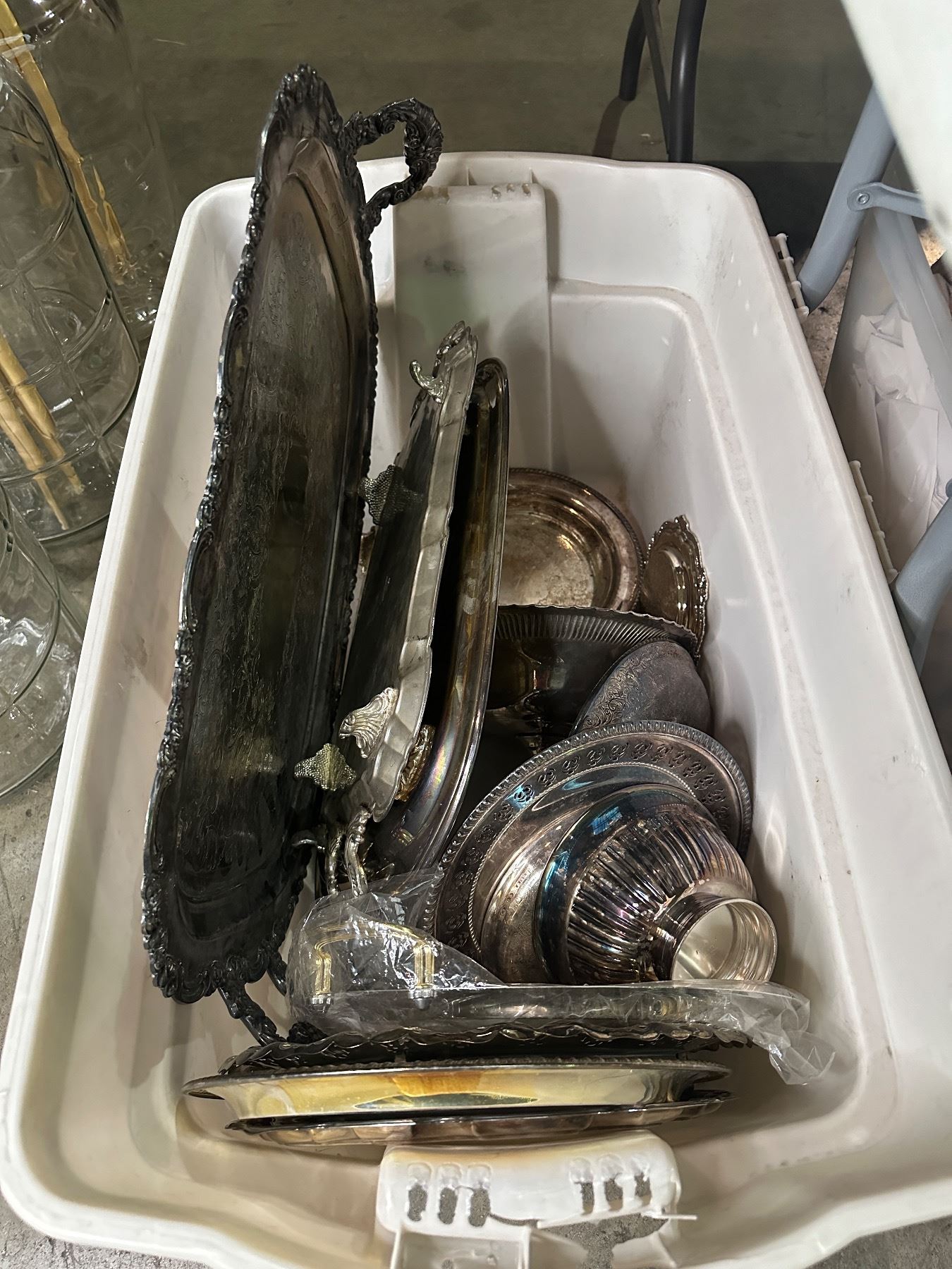 Tote full of assorted silverware w/ trays/ bowls etc.