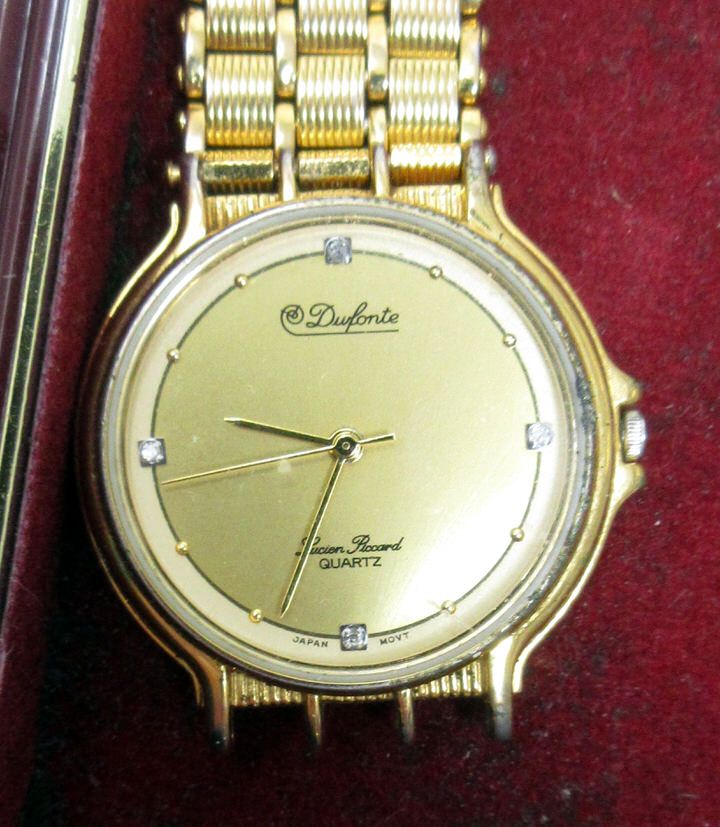 Some vintage. Dufonte Lucien Picard watch needs a bracelet pin. Bonica BML watch has personal inscription on the back. Tray not included.