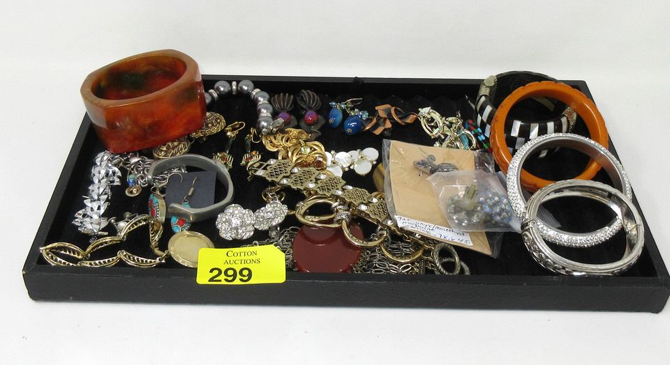 15 Pairs of Vintage Clip or Screw Back Earrings and 17 Bracelets (Coro, Brighton, and more). Carnelian mesh bracelet has a 40 mm x 52 mm center stone.