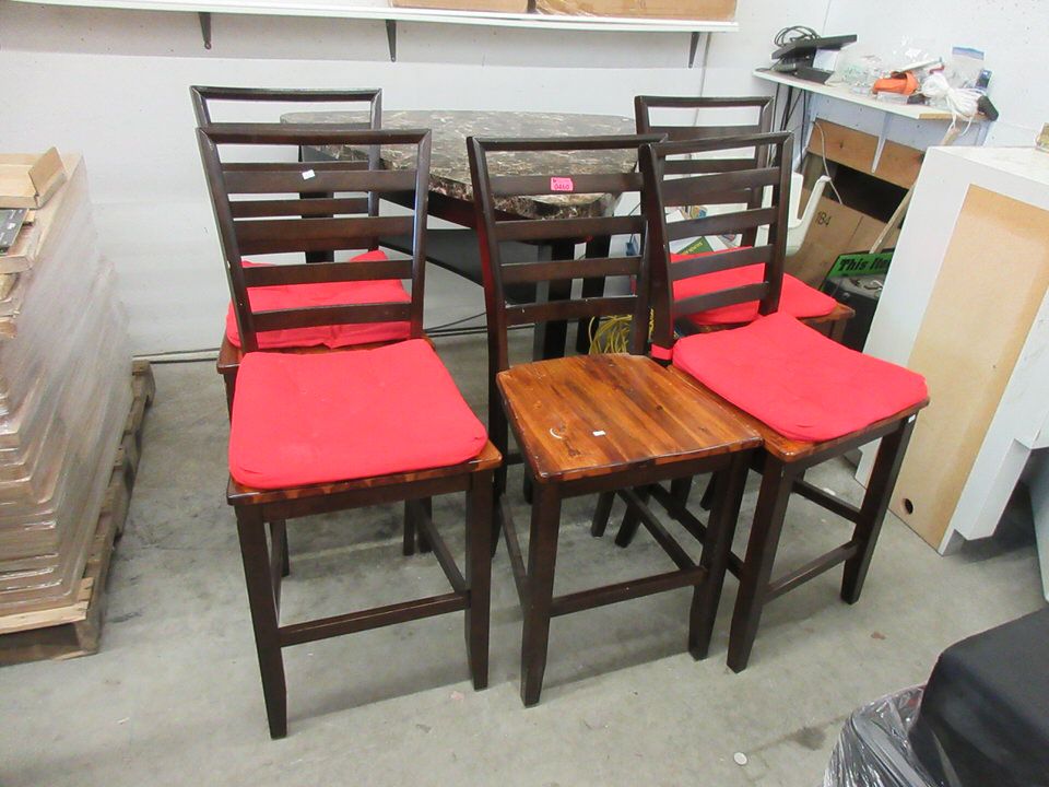 Triangular Counter Height Dining Table - 48" x 48" x 36" tall. 5 Dining Chairs- 24" tall at the seat.