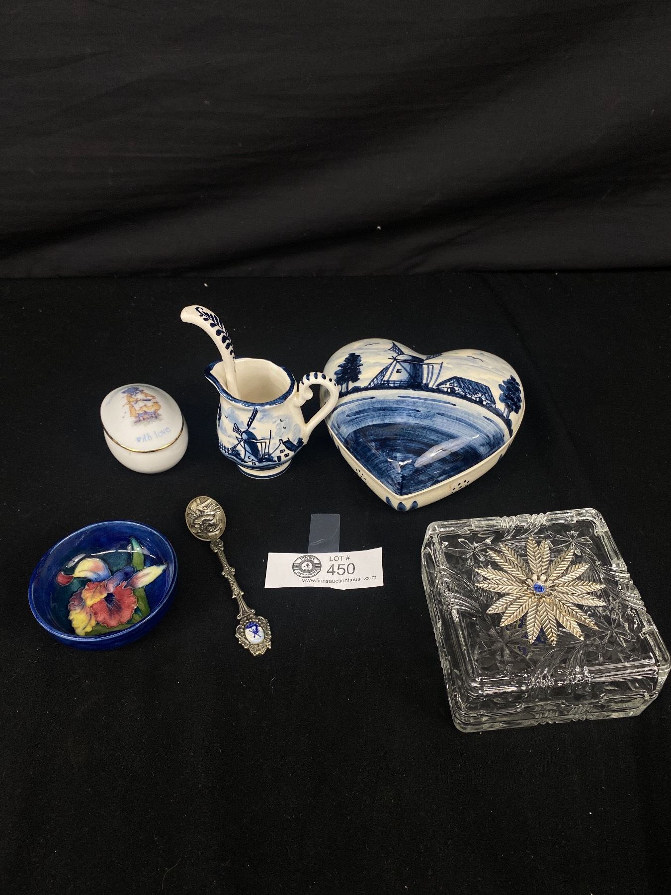 Trinket Box and Delft Lot- Italy, Moorcroft (Repair) Large Heart, Creamer + Two Spoons