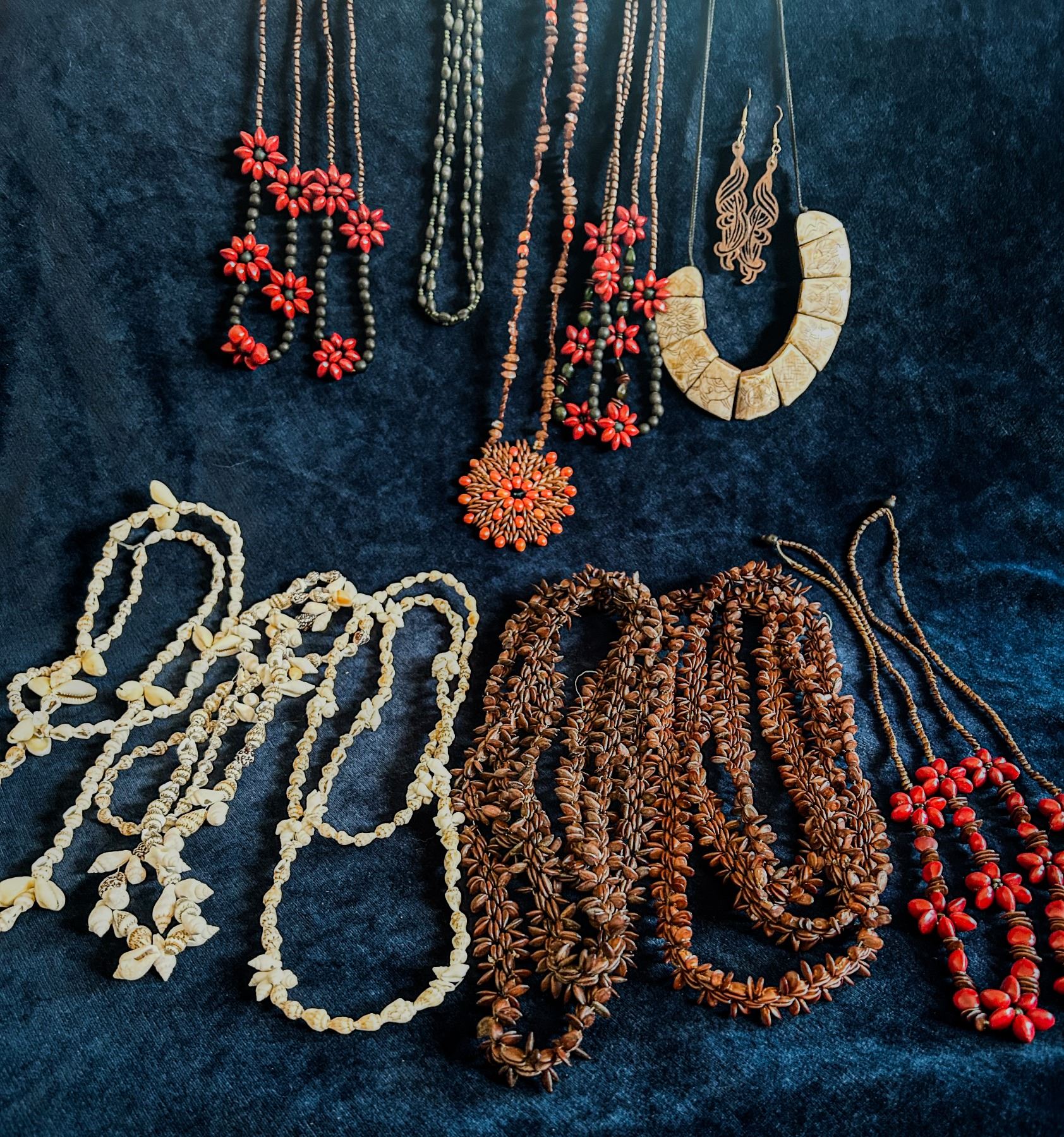 Large lot of vintage tropical jewelry featuring natural seed materials, including red and orange seed bead strands, apple seed necklaces/leis, and shell leis. Includes a carved horn choker with tribal-style etching and coordinating laser-cut wood earrings.