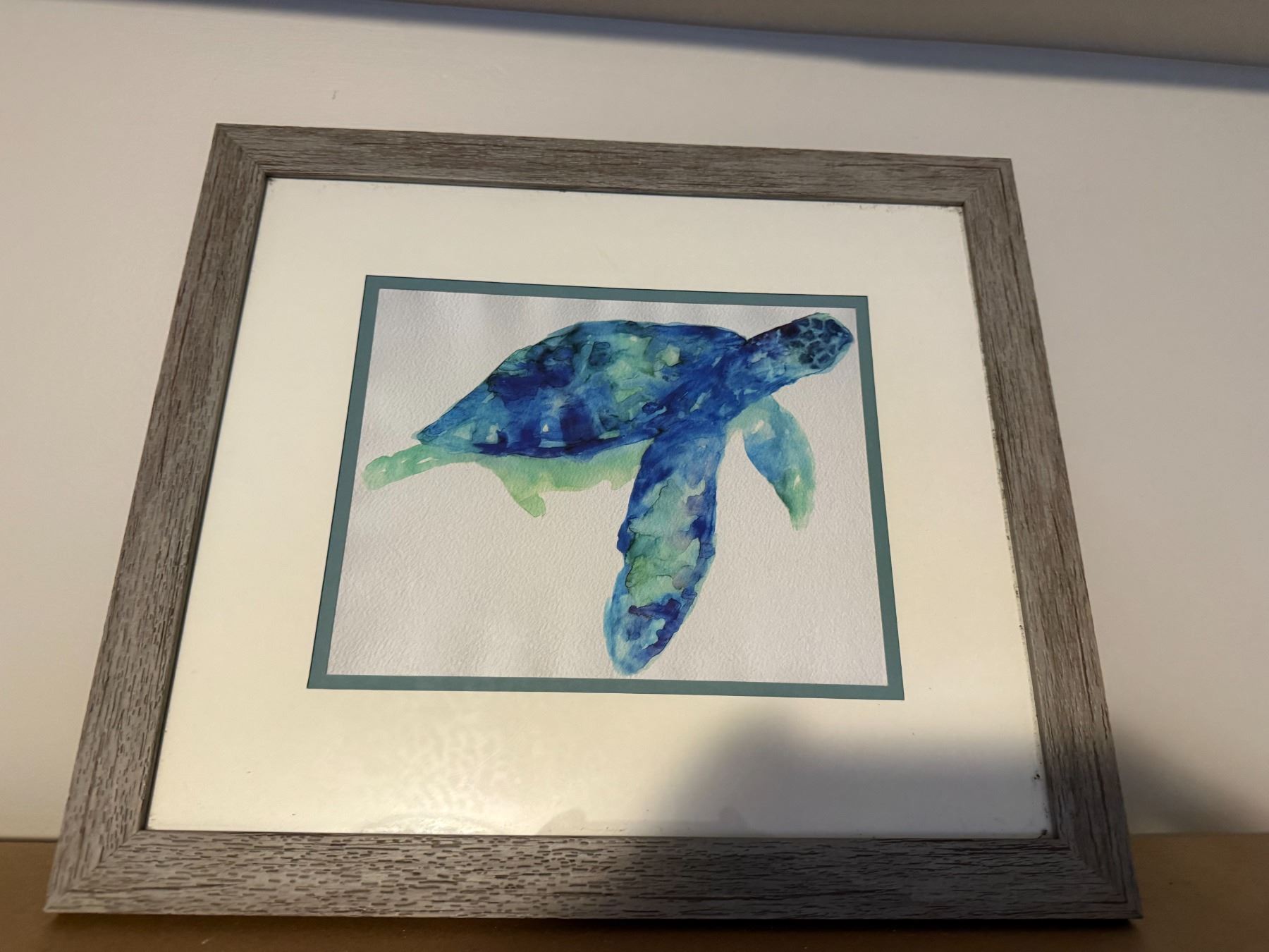 Blue and green painted turtle wall hanging.