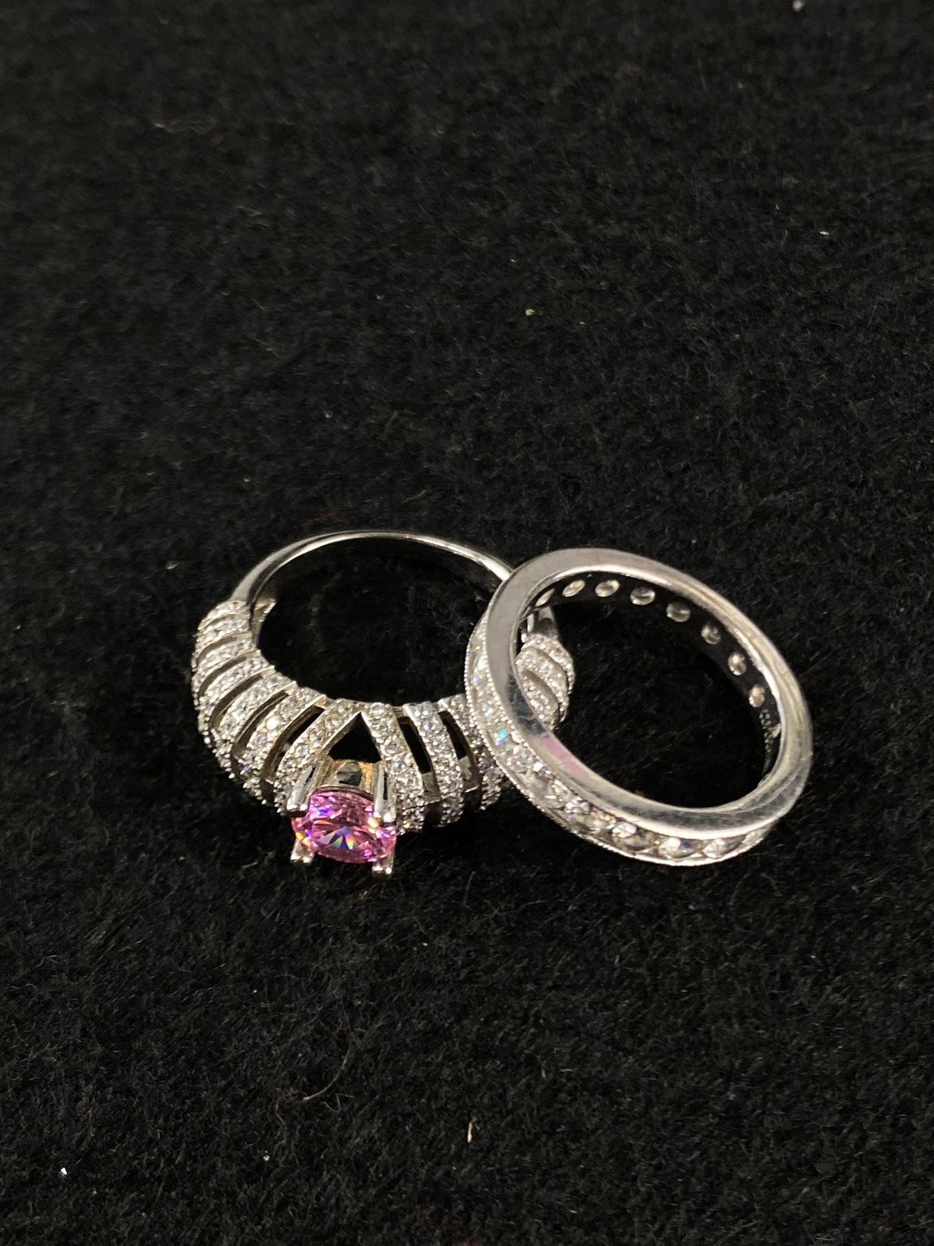 Two 925 Sterling Silver Cubic Zirconia Rings: White CZ Eternity Band, Pink & Clear - Both Size 6 - 6.9g - Tested