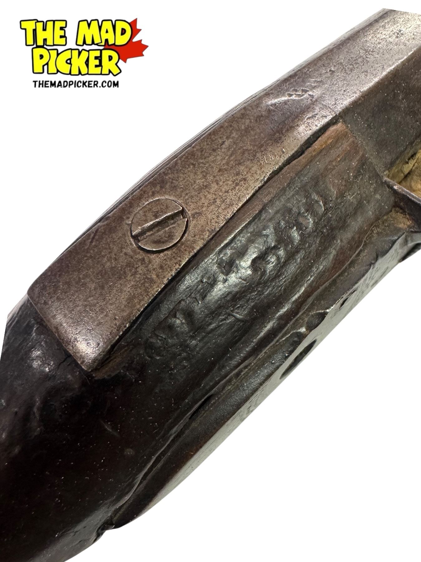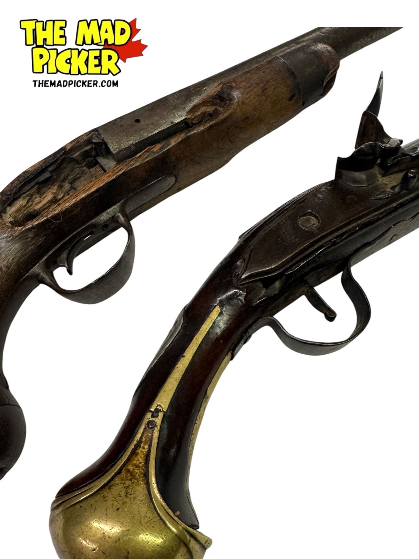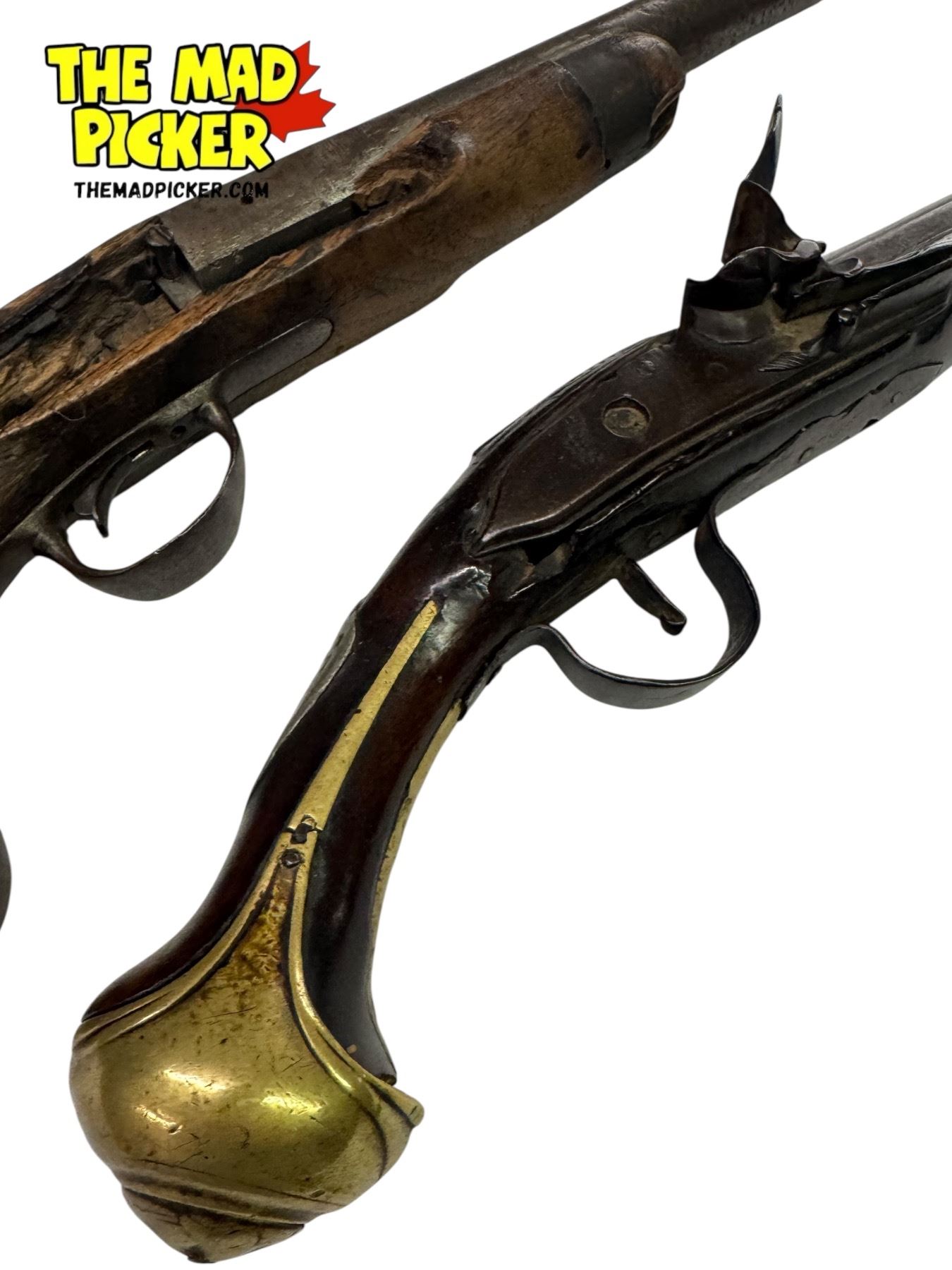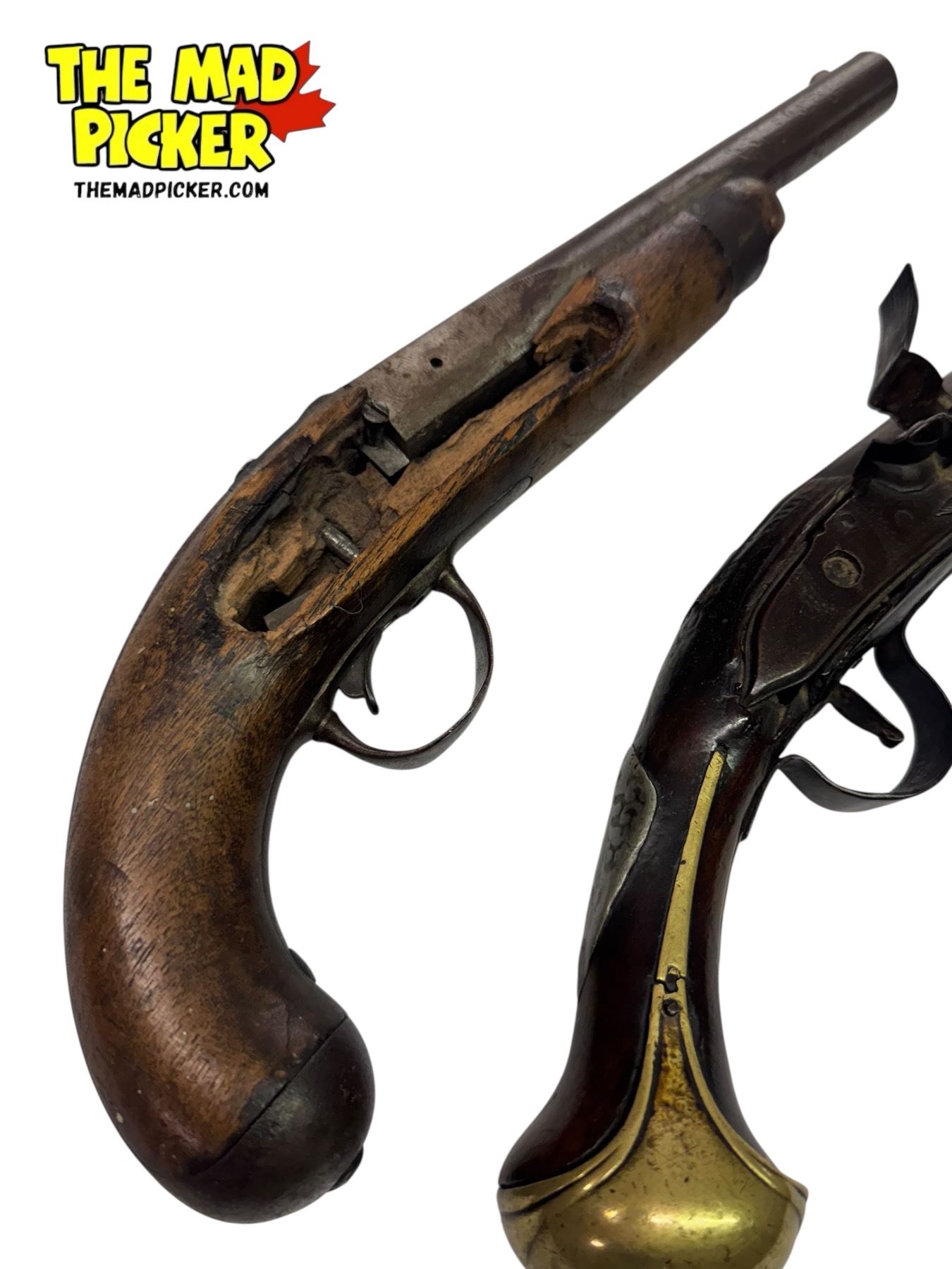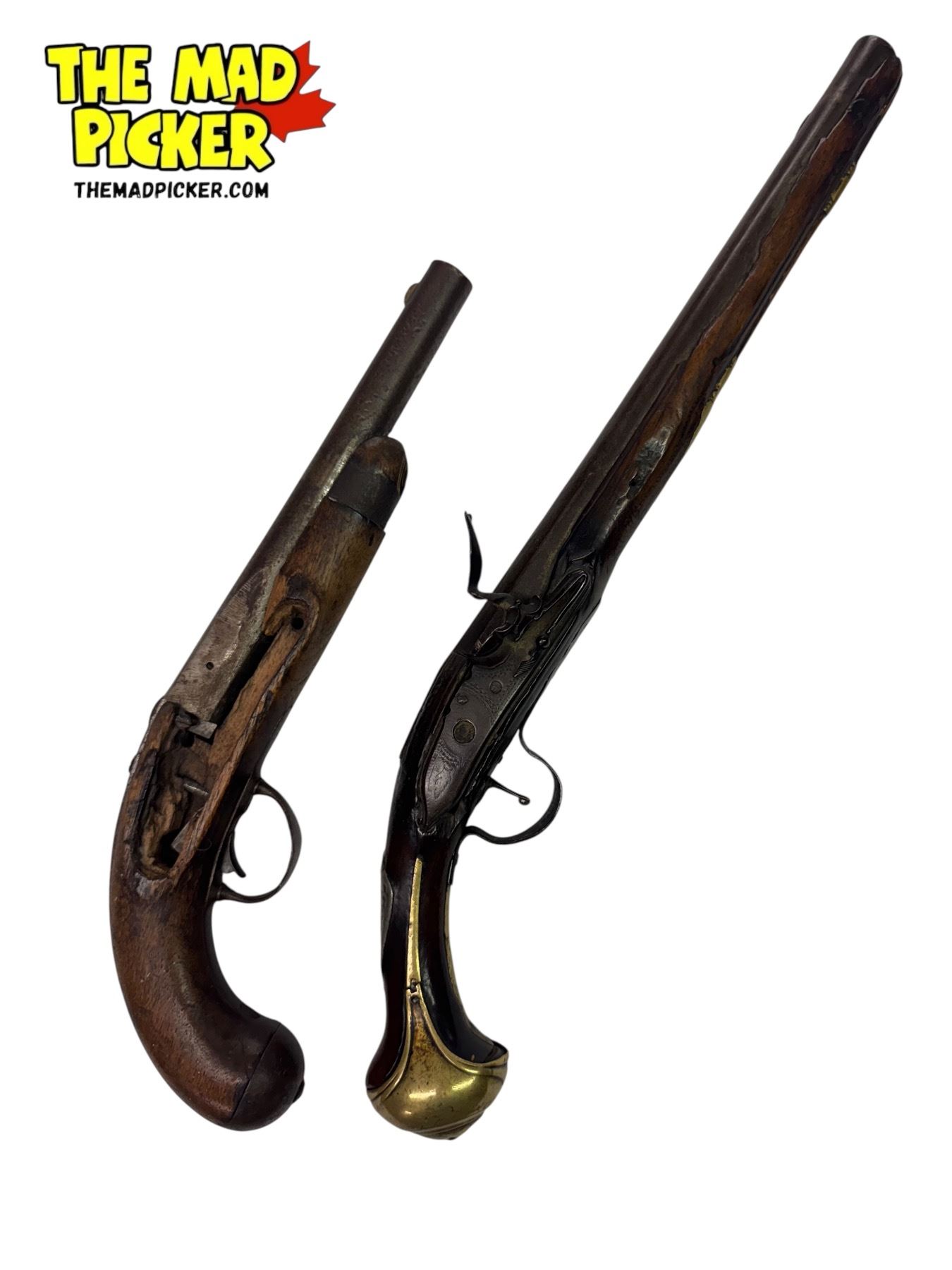 Both show some wear with one having significant damage to the frame. The larger brass handled pistol is missing the hammer.