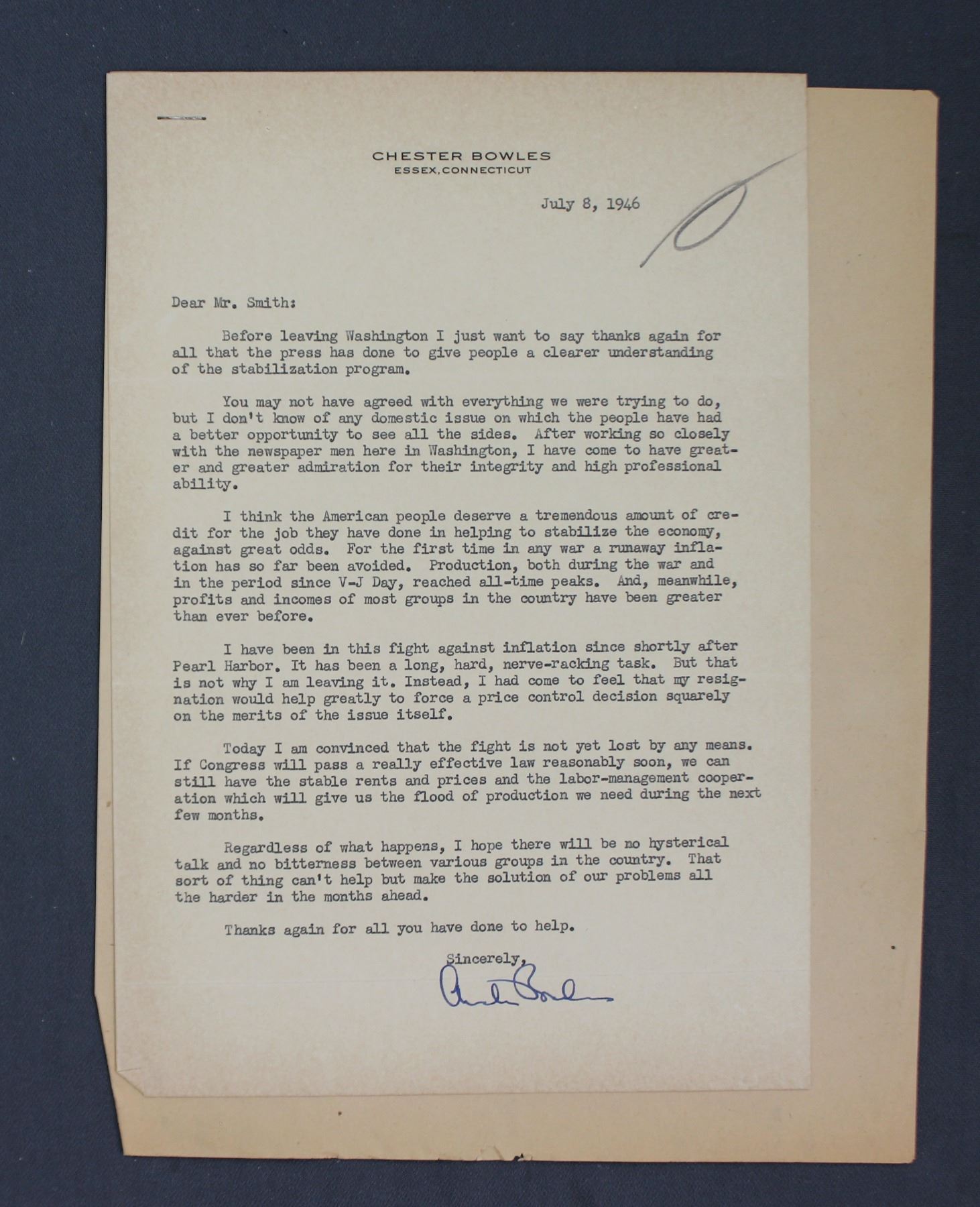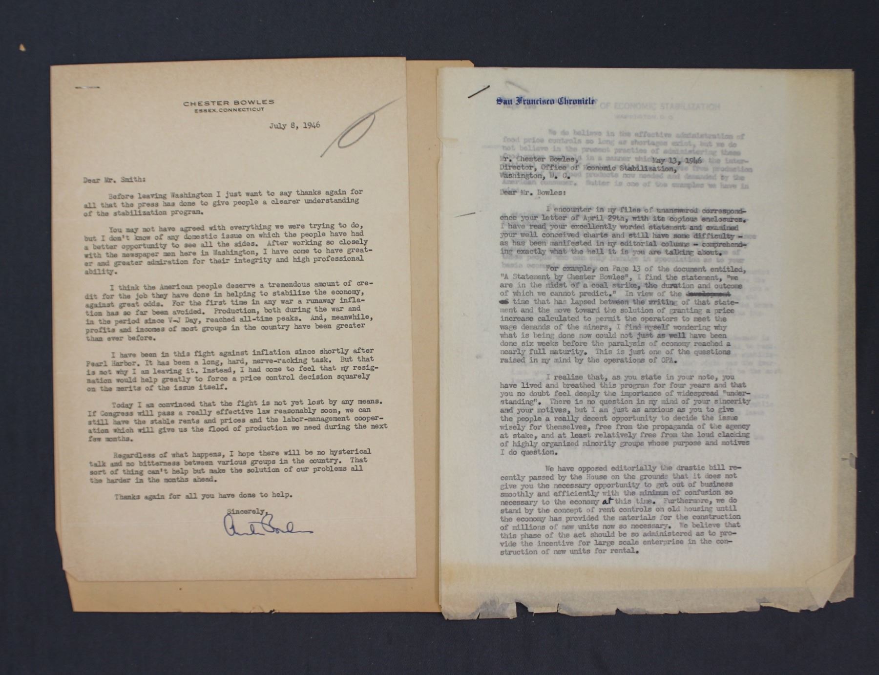 Two Chester Bowles Typed Letters Signed "Chester Bowles"; re: Postwar Stabilization.