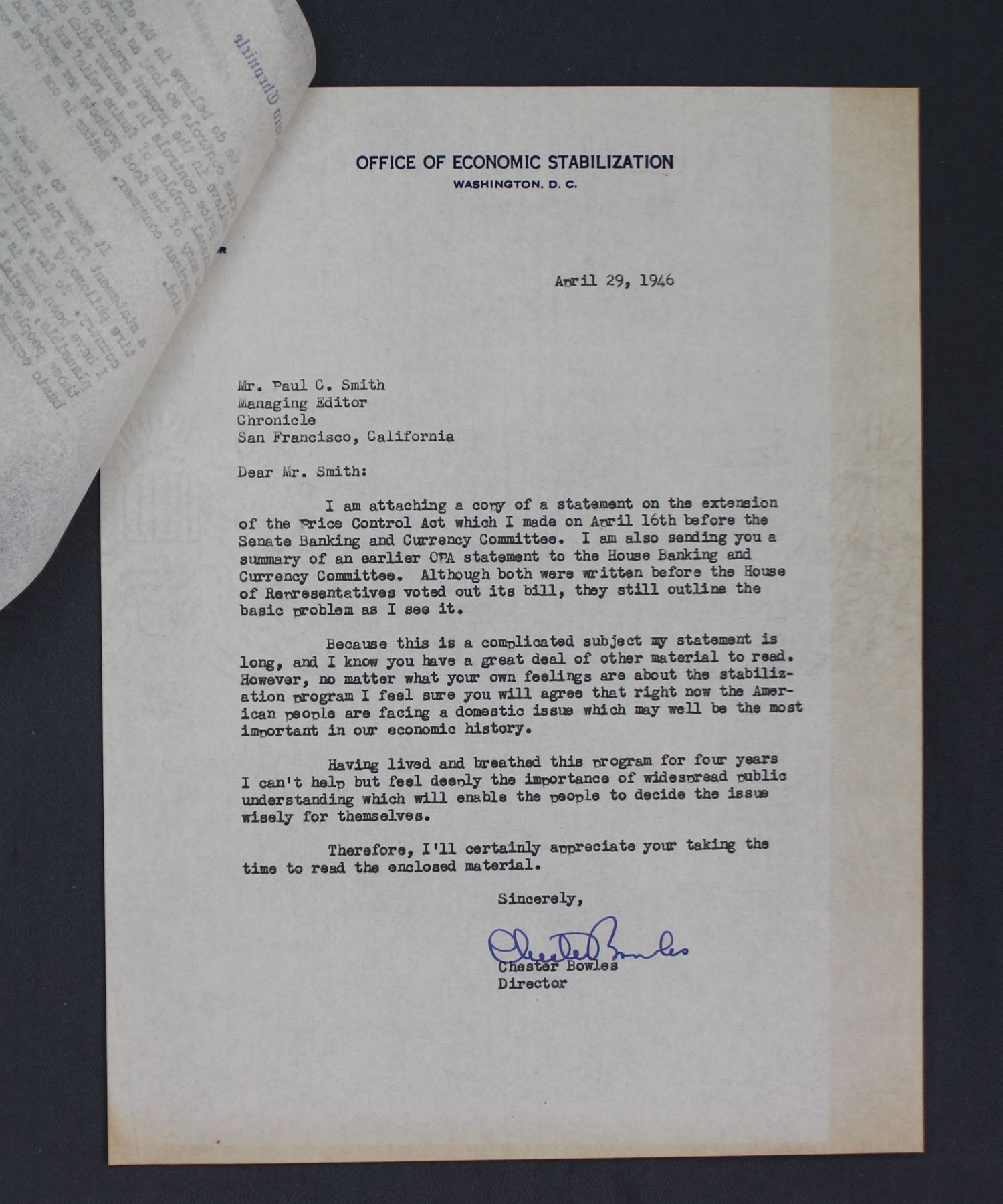 Both letters addressed to Paul C. Smith, who was at the time Chief Editor of the San Francisco Chronicle. Also included are carbon copies of replies by Smith.