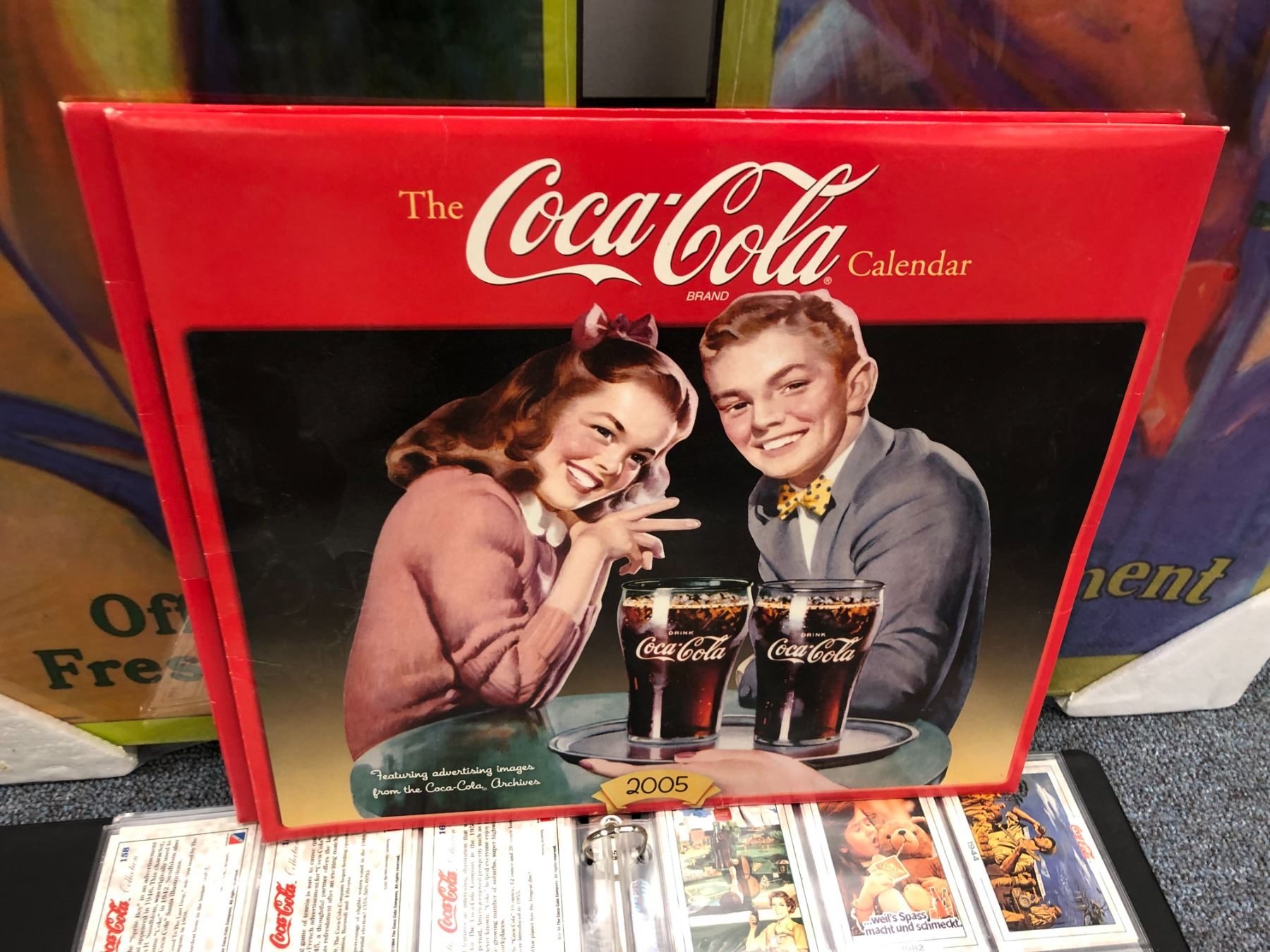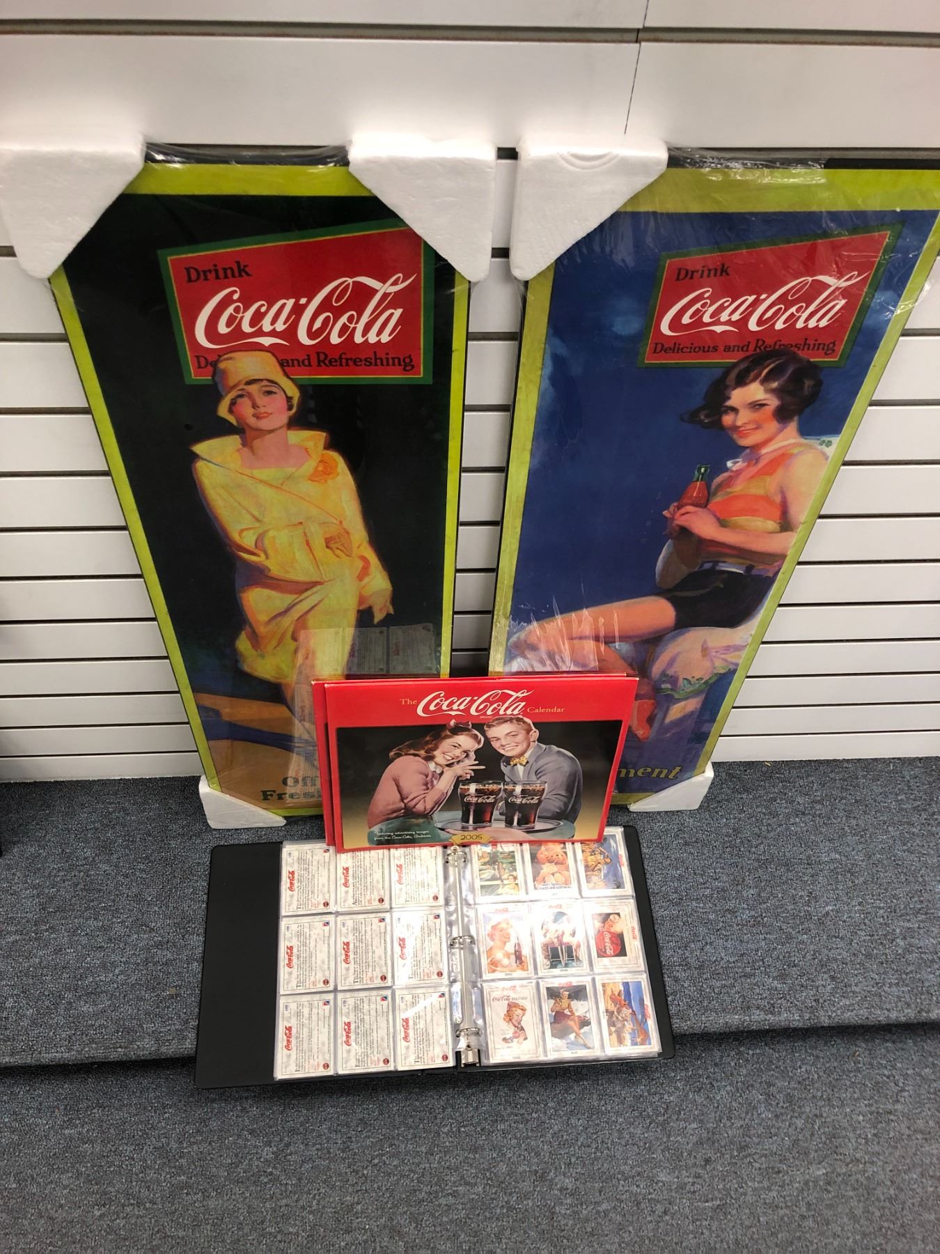 Two Coca Cola advertisement prints on board/ 2 Coca Cola calendars from 2005 & album of Coca Cola trading cards