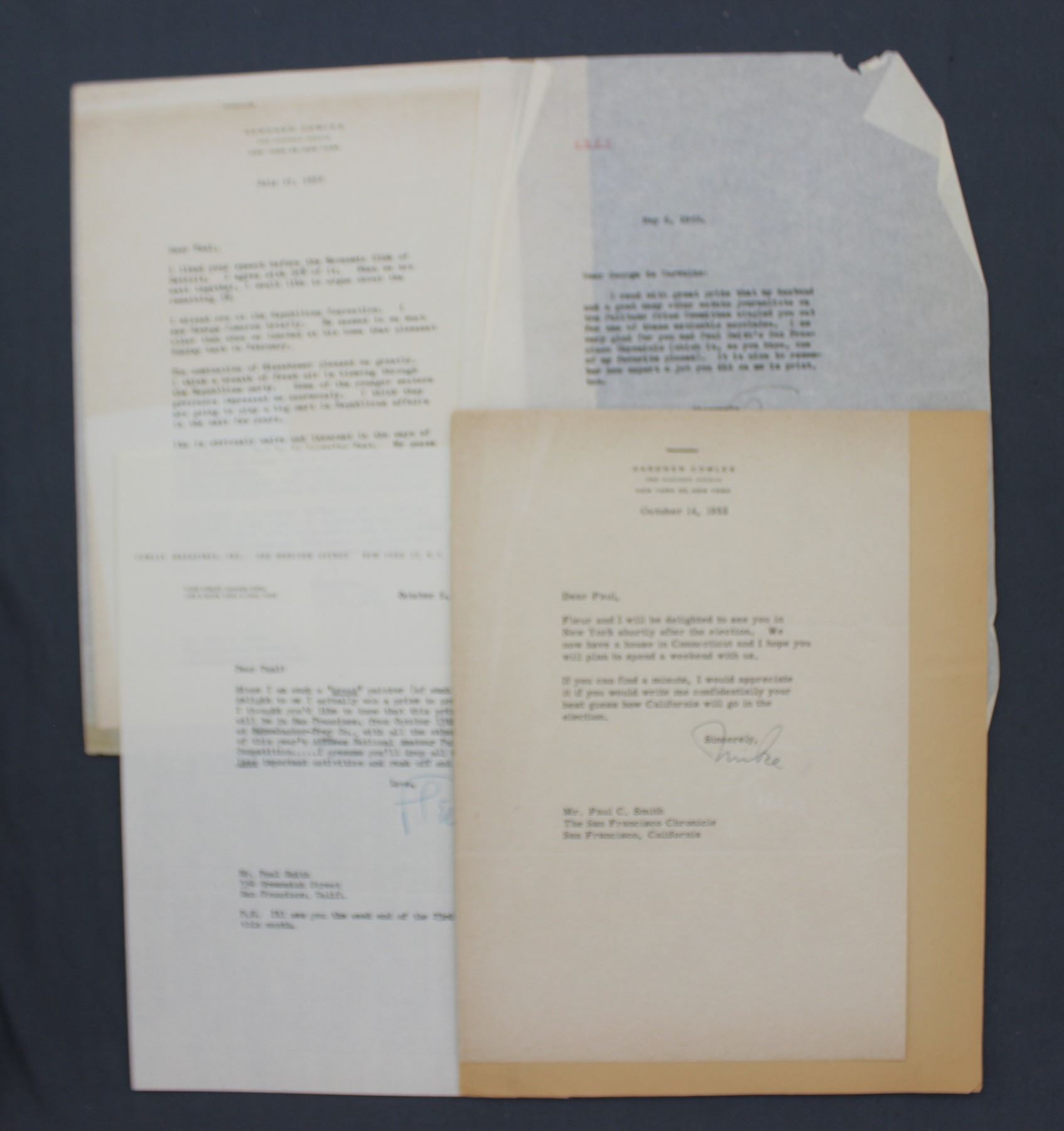 Two Gardner "Mike" Cowles and Two Fleur Cowles Typed Letters Signed; Political Commentary.