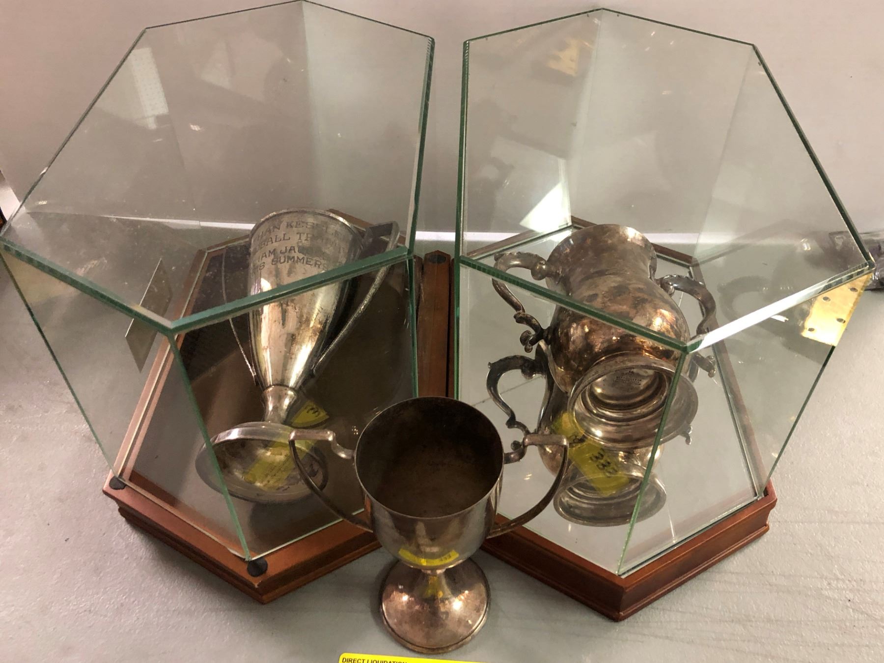 Two Glass Display Trophy Cases with - sterlingsilver trophies plus one trophy without case
