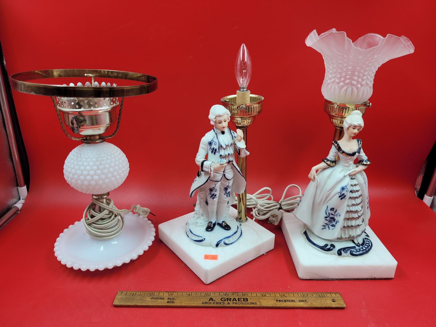 Two Porcelain Figurine Lamps On Alabaster Bases & Milk Glass Lamp