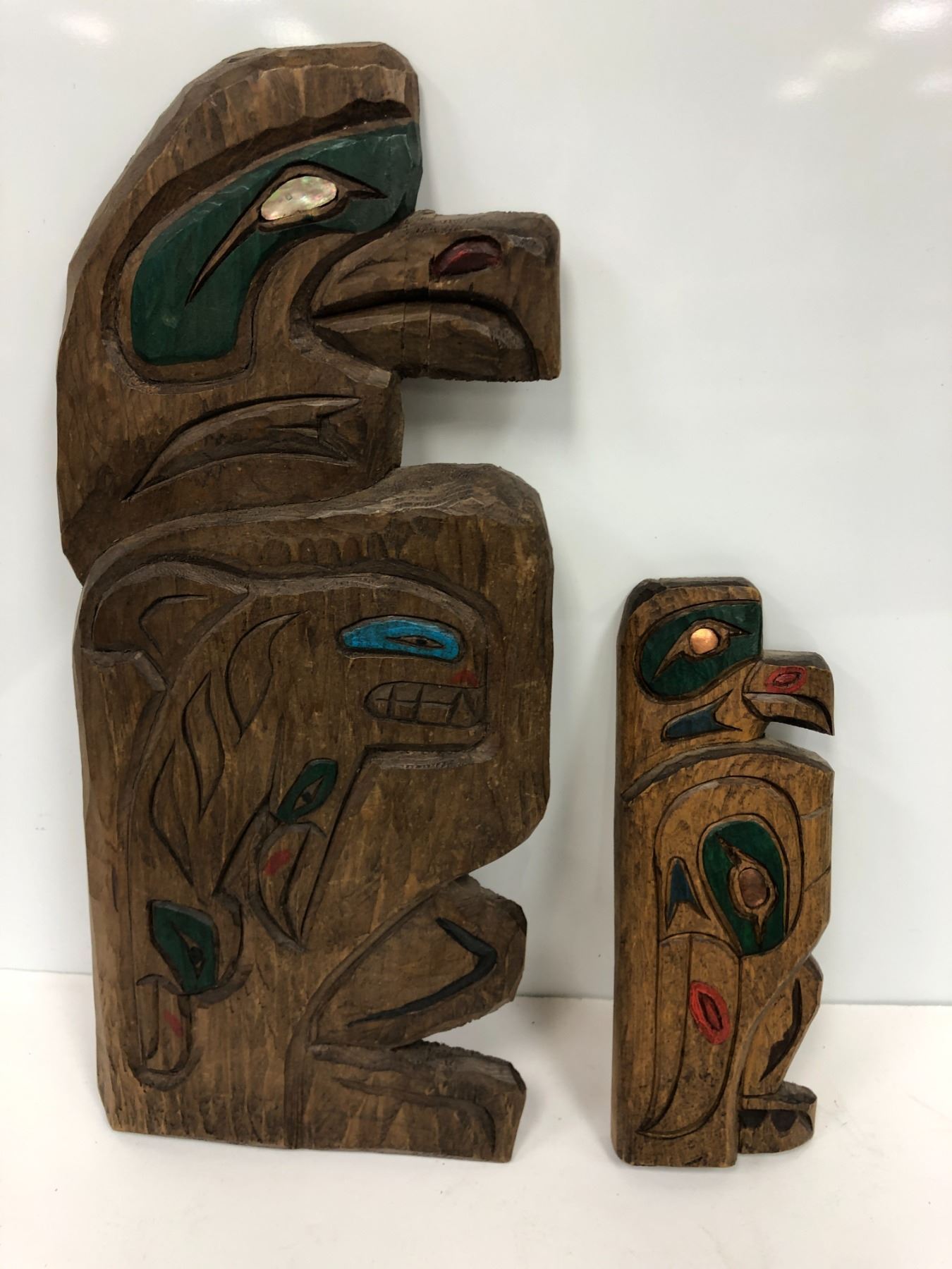 Two West Coast First Nations carved wooden plaques "Eagle/ Killer Whale/ Raven" (unsigned) - 16in & 9in plaques