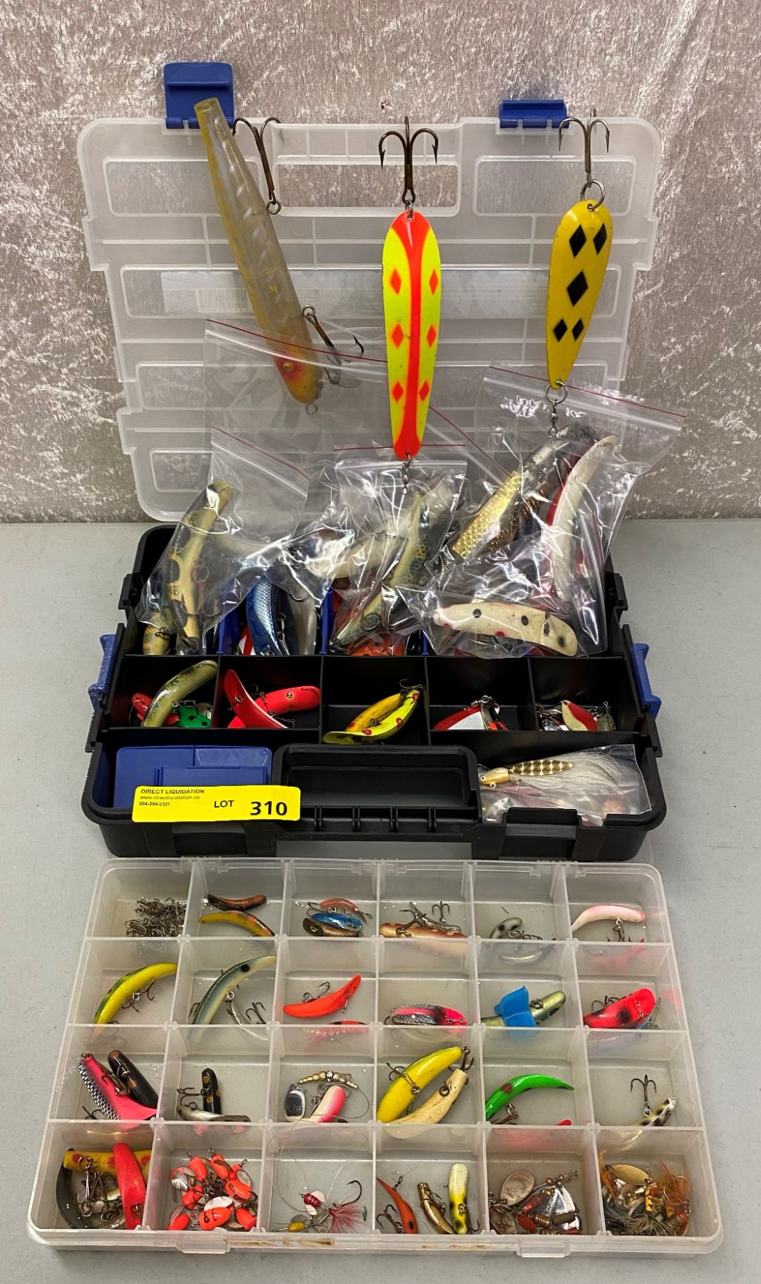 Two boxes filled with assorted vintage flat fish lures & spoons