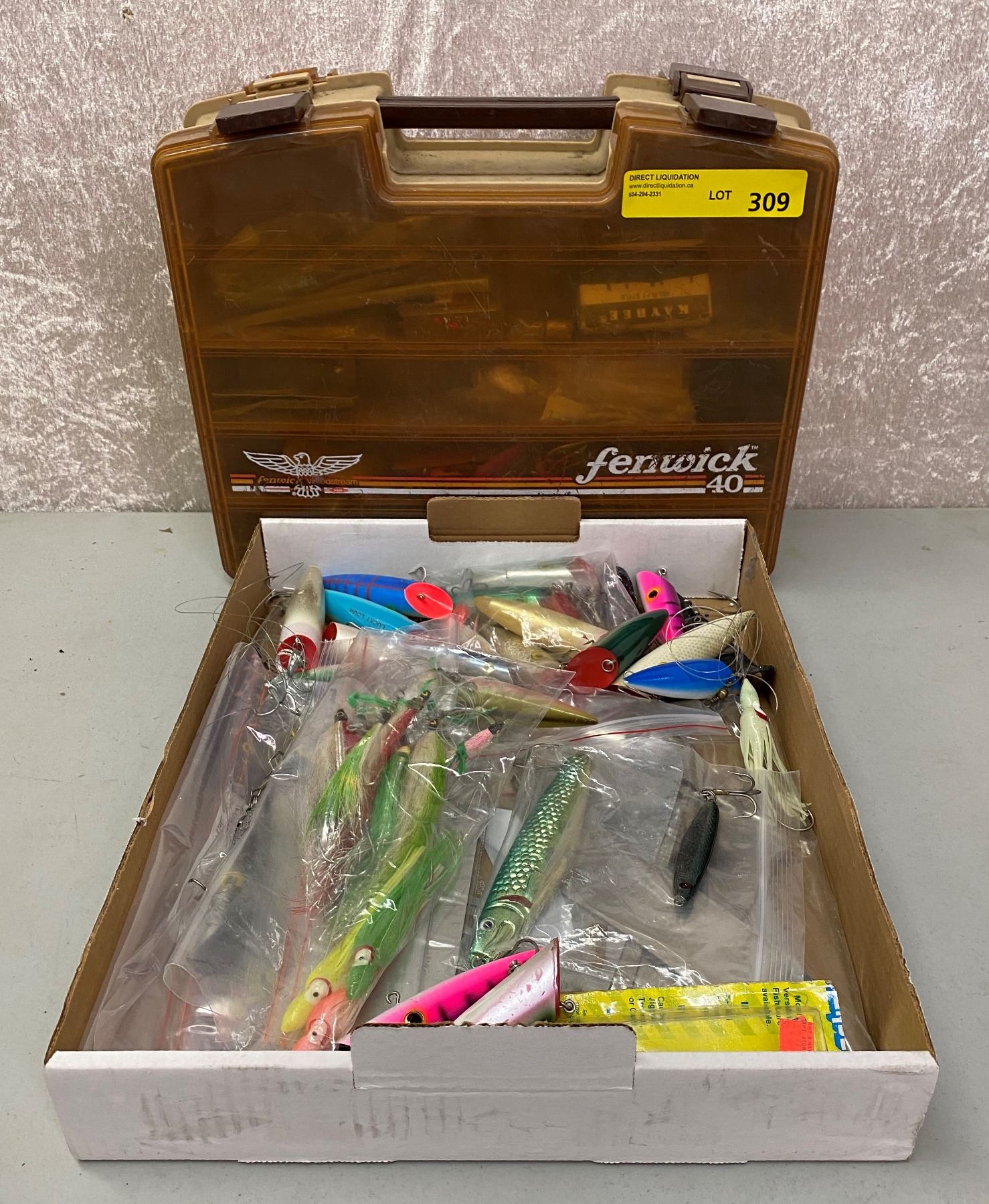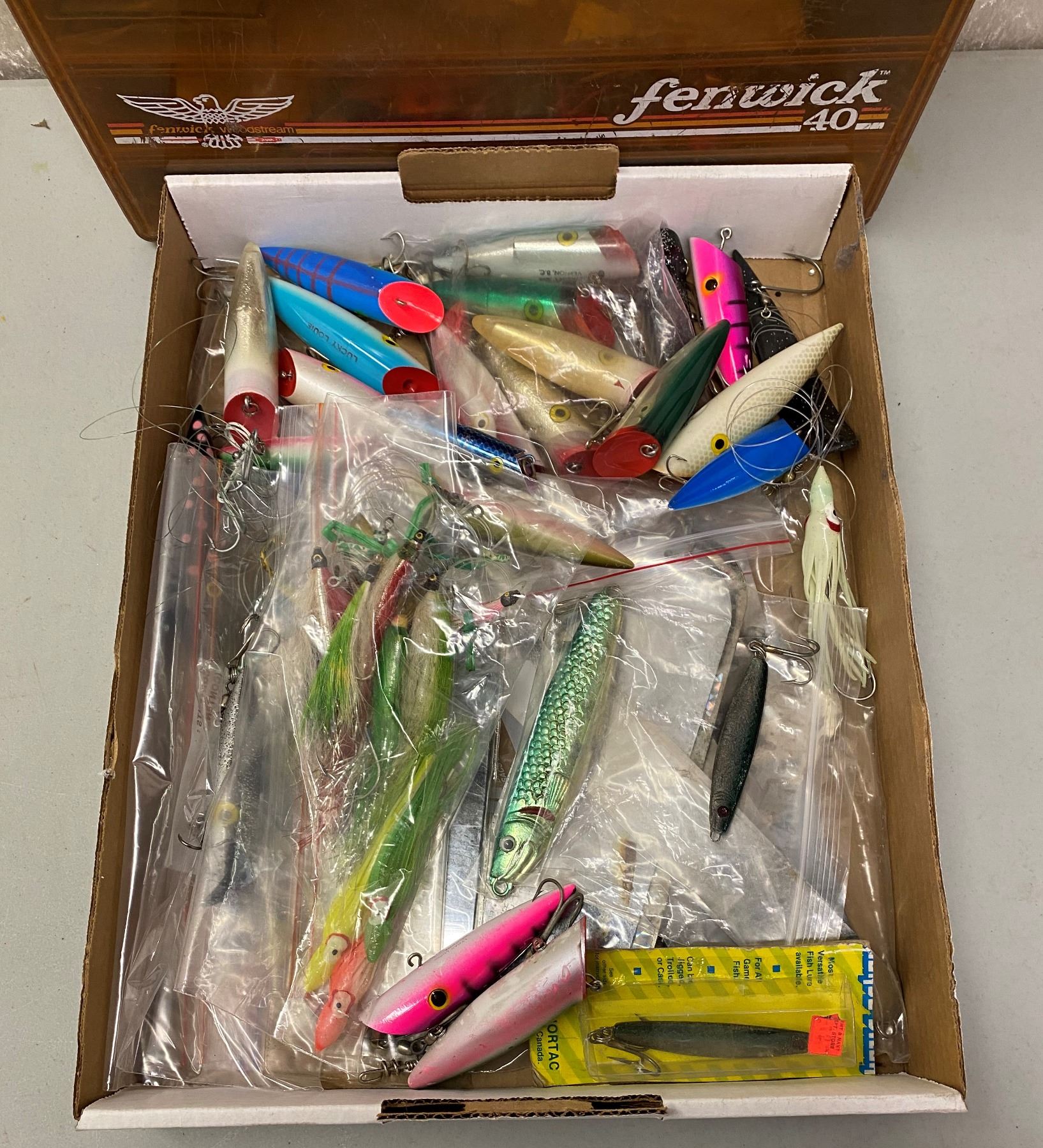 Two boxes of assorted salmon ocean fishing gear - salmon plugs/ jigs/ hoochies/ flashers etc.