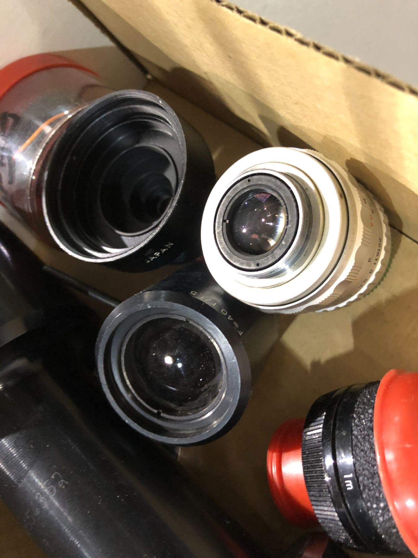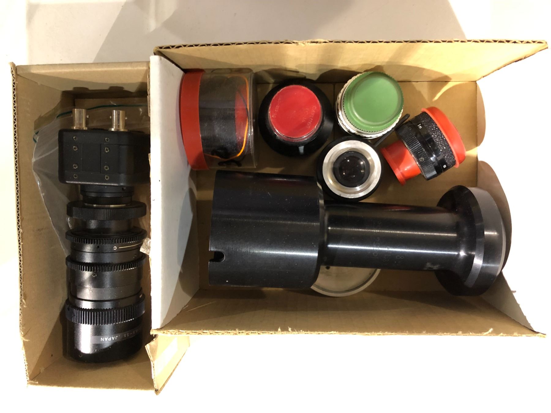Two boxes of assorted vintage camera lenses