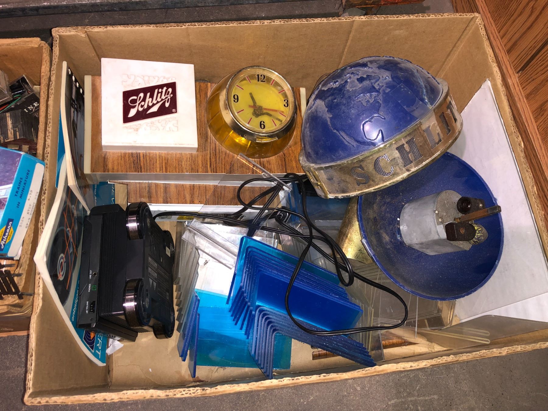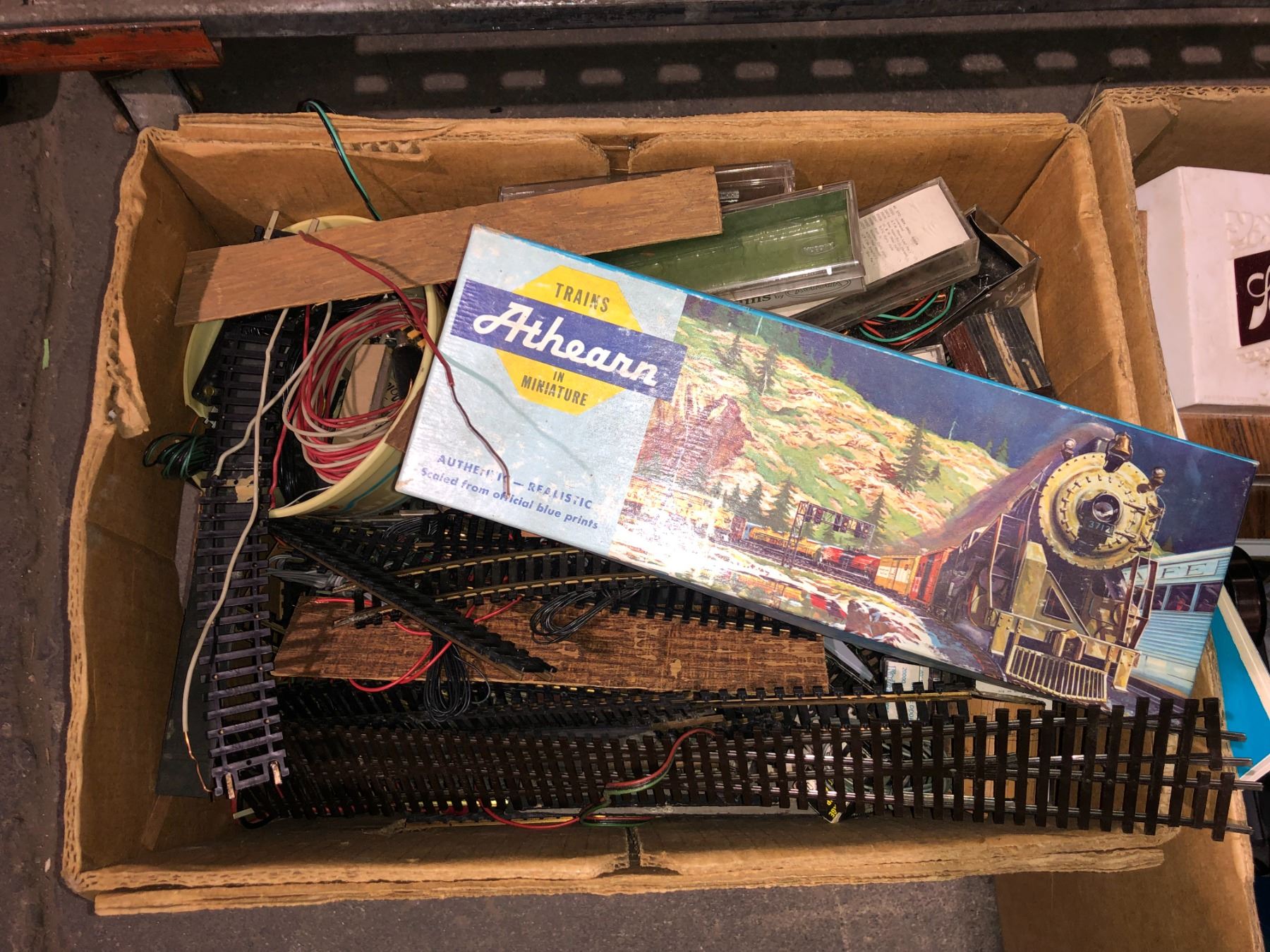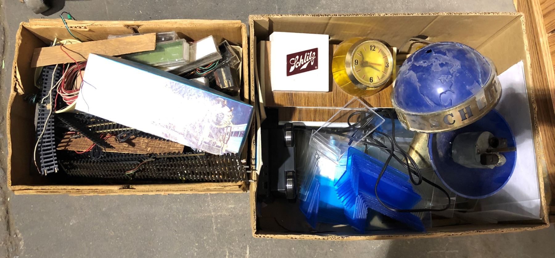 Two boxes of misc. vintage items - assorted Hobby Train items/ vintage beer advertisement signs etc.