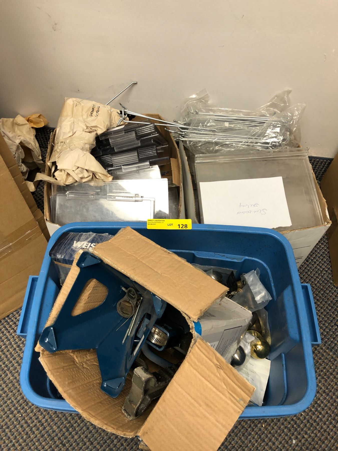 Two boxes of slat board acrylic shelving, Pegs, Tub of Door Hardware and Axel Stands.