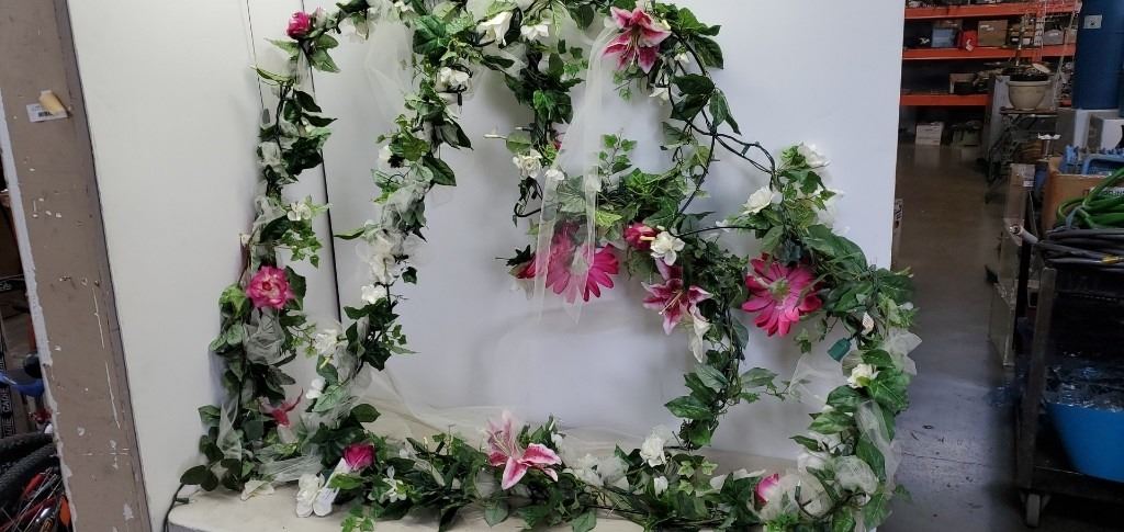 Two decorative metal frame 41 in hearts with lights and artificial flowers