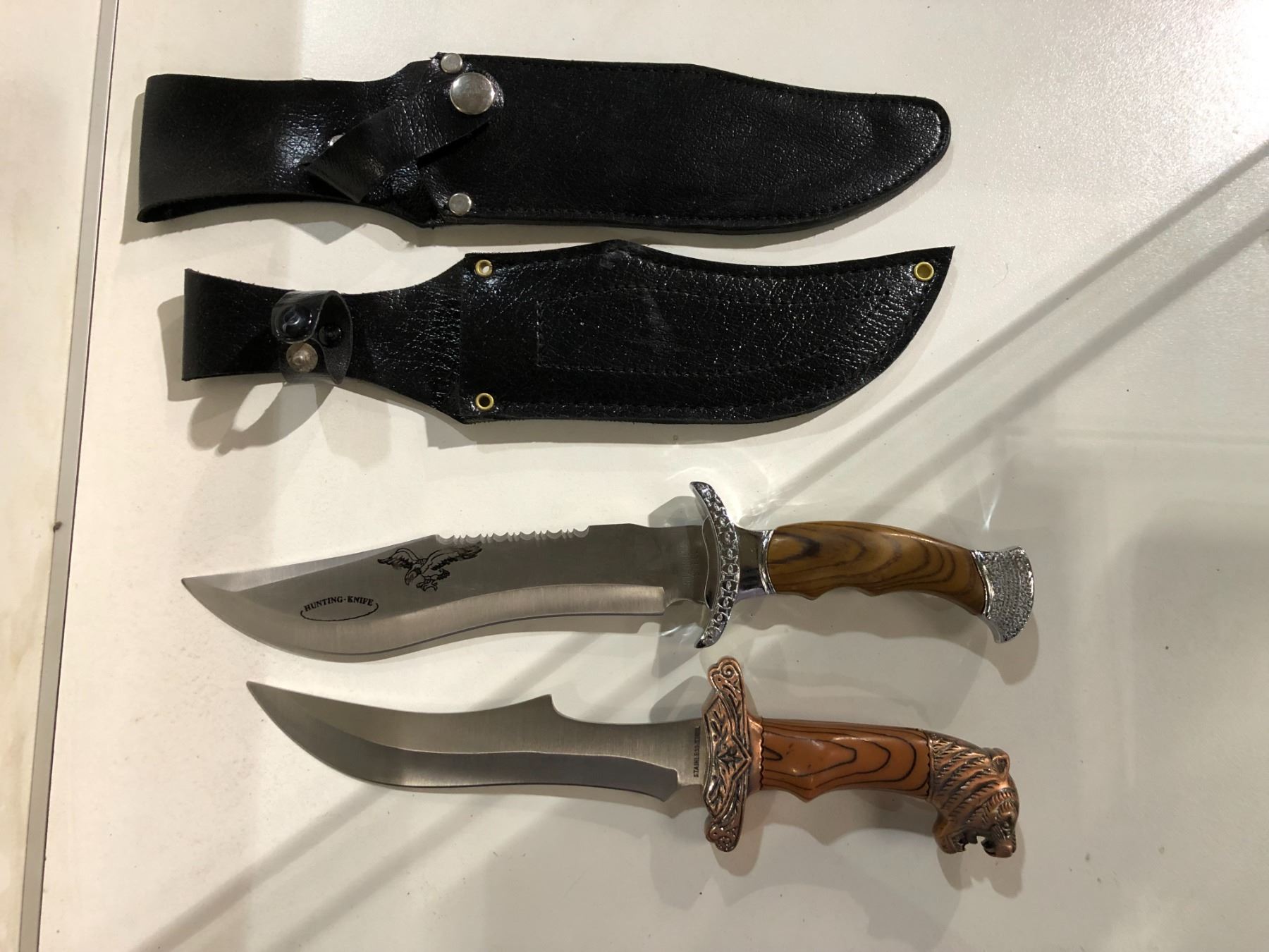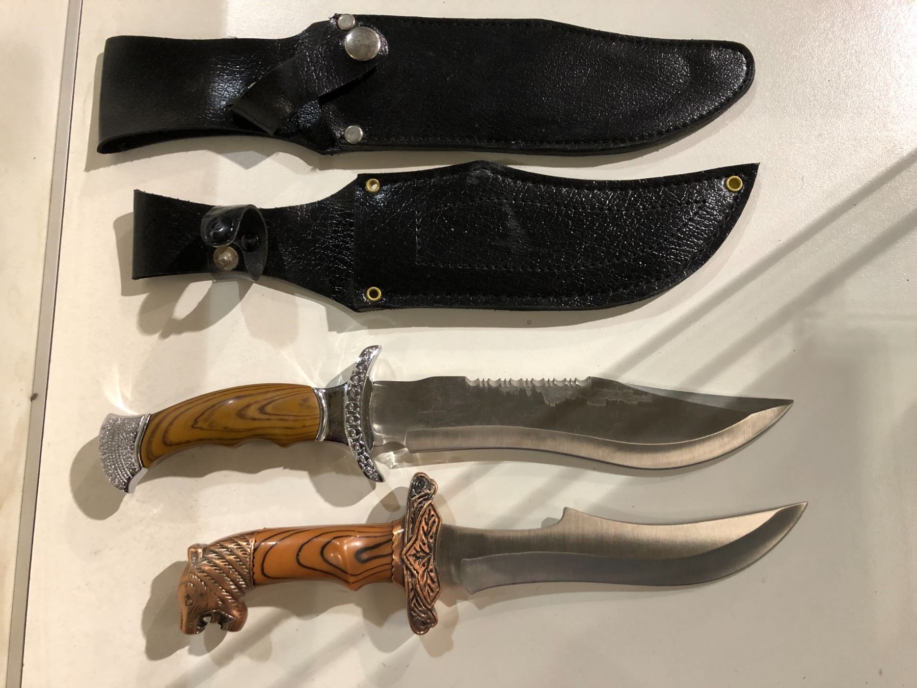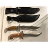 Two hunting/ fighting style knives w/ black leather sheath