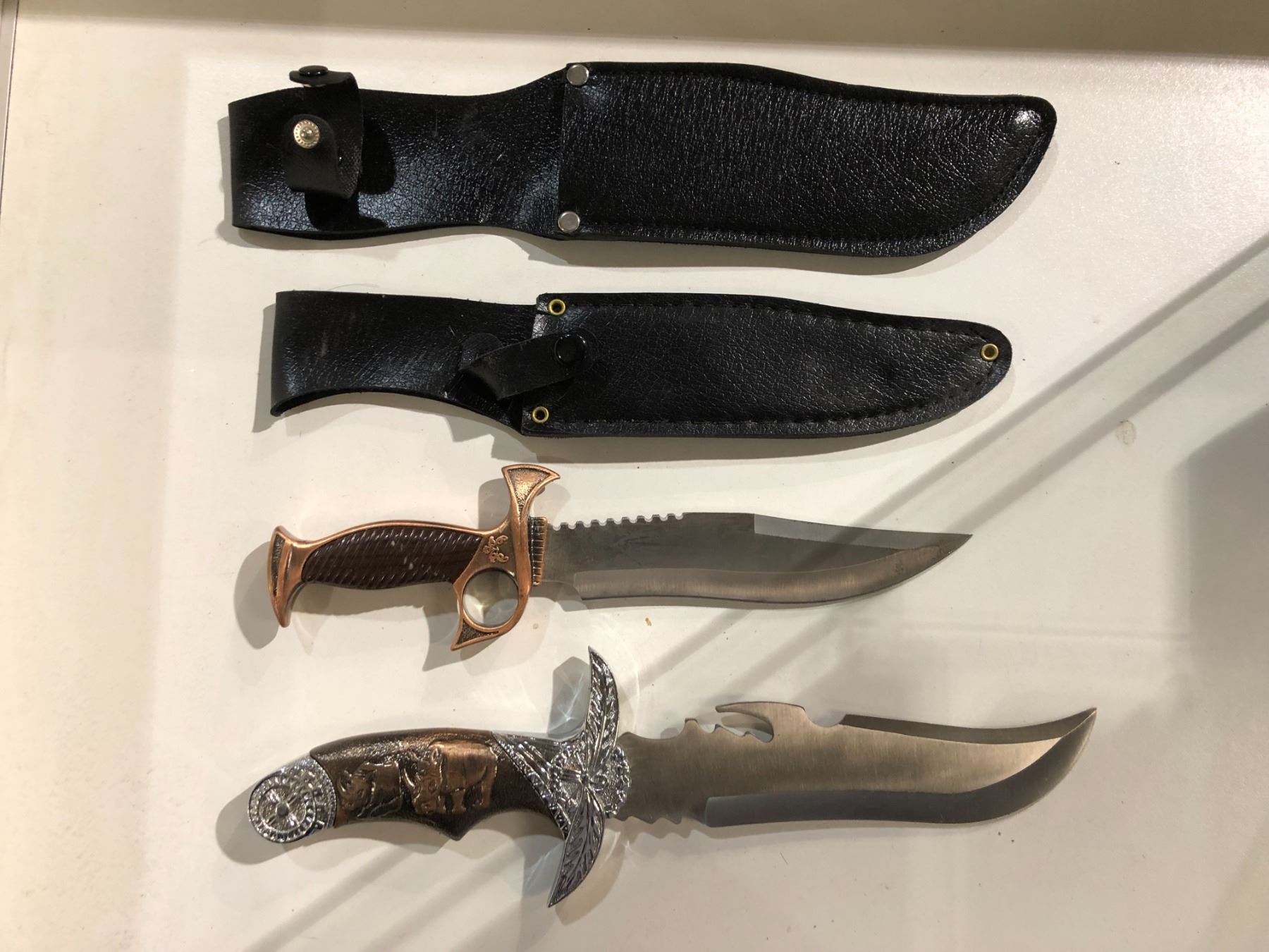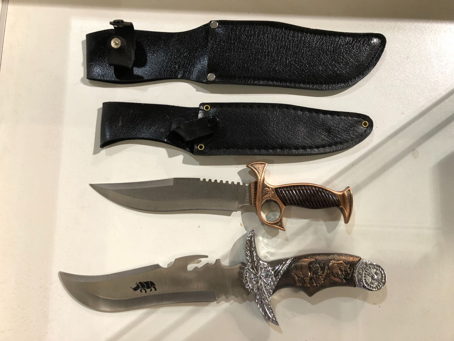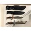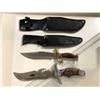 Two hunting/ fighting style knives w/ black leather sheath