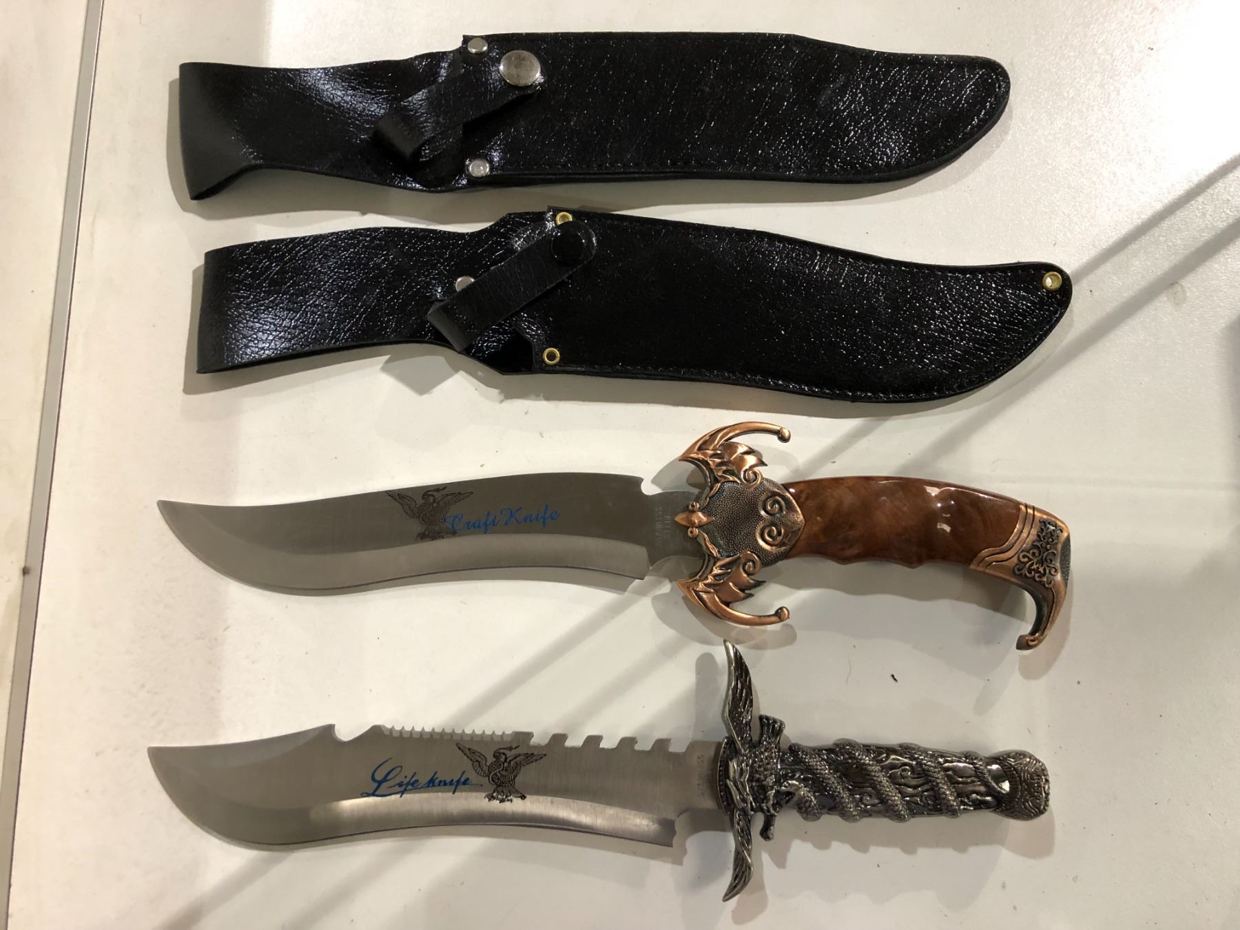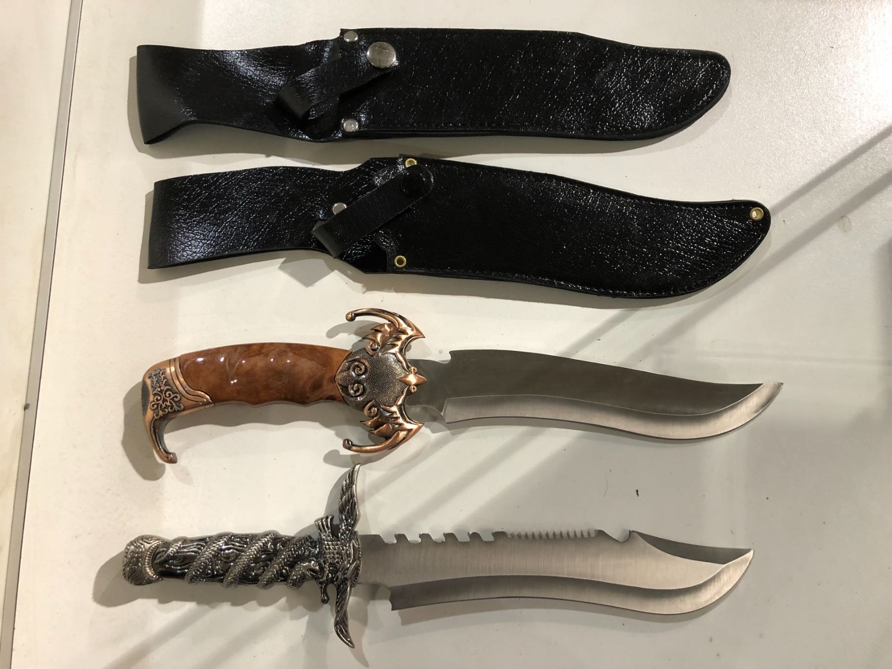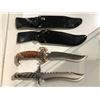 Two hunting/ fighting style knives w/ black leather sheath