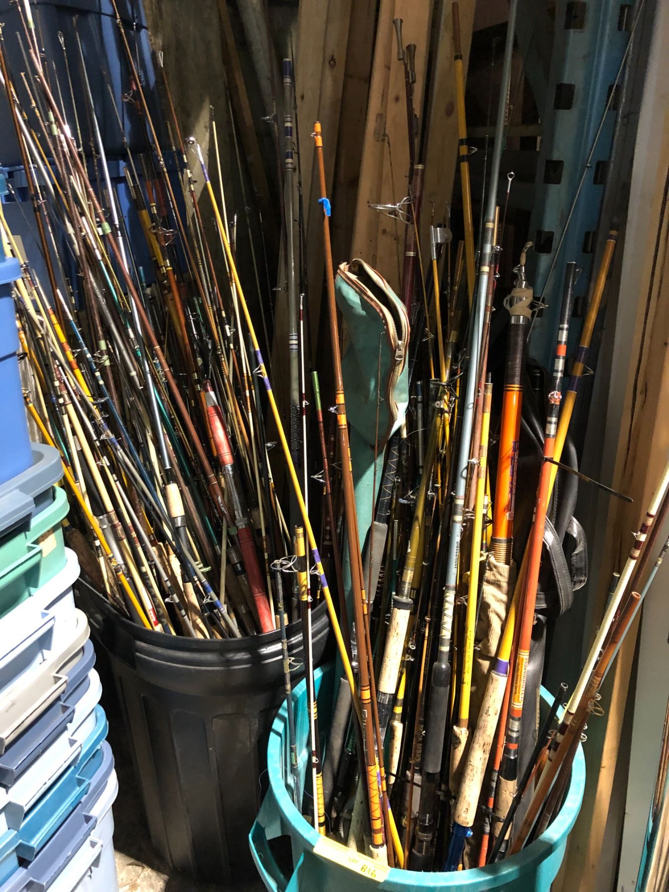 Two large garbage pails filled w/ fishing rods (FOR PARTS OR REPAIR ONLY)