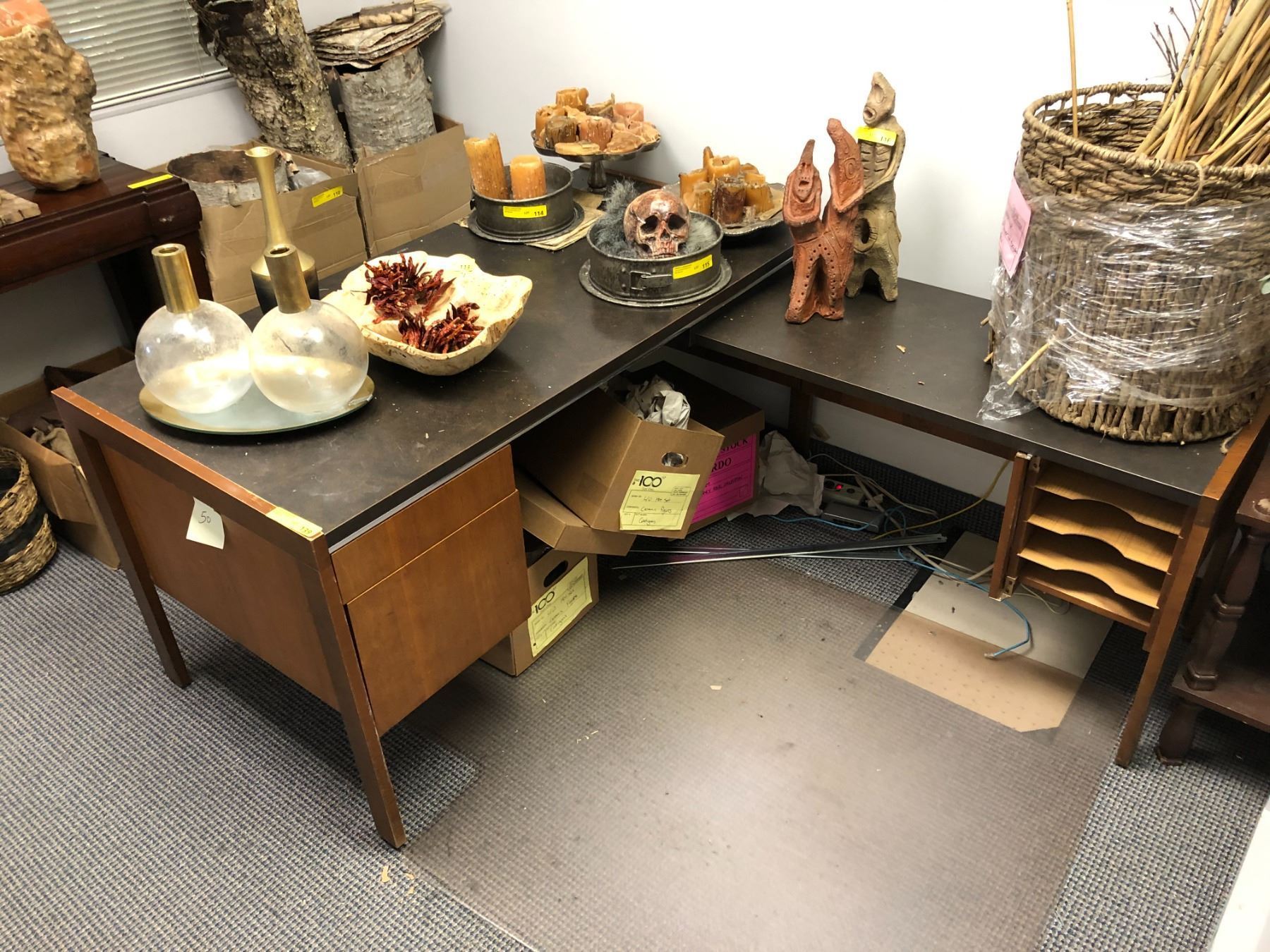 Two pc. L shaped wooden desk & small wooden side table from the production of the show