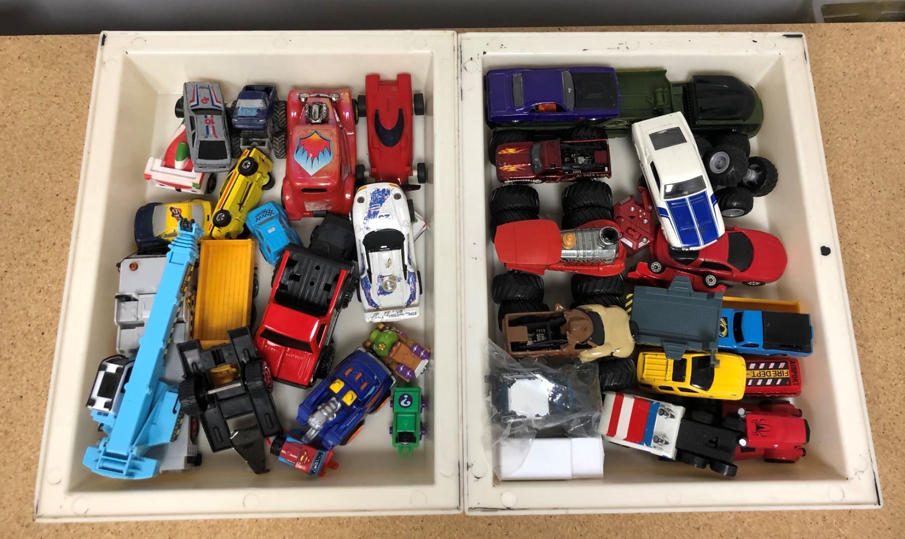 Two white bins filled w/ assorted die-cast toys