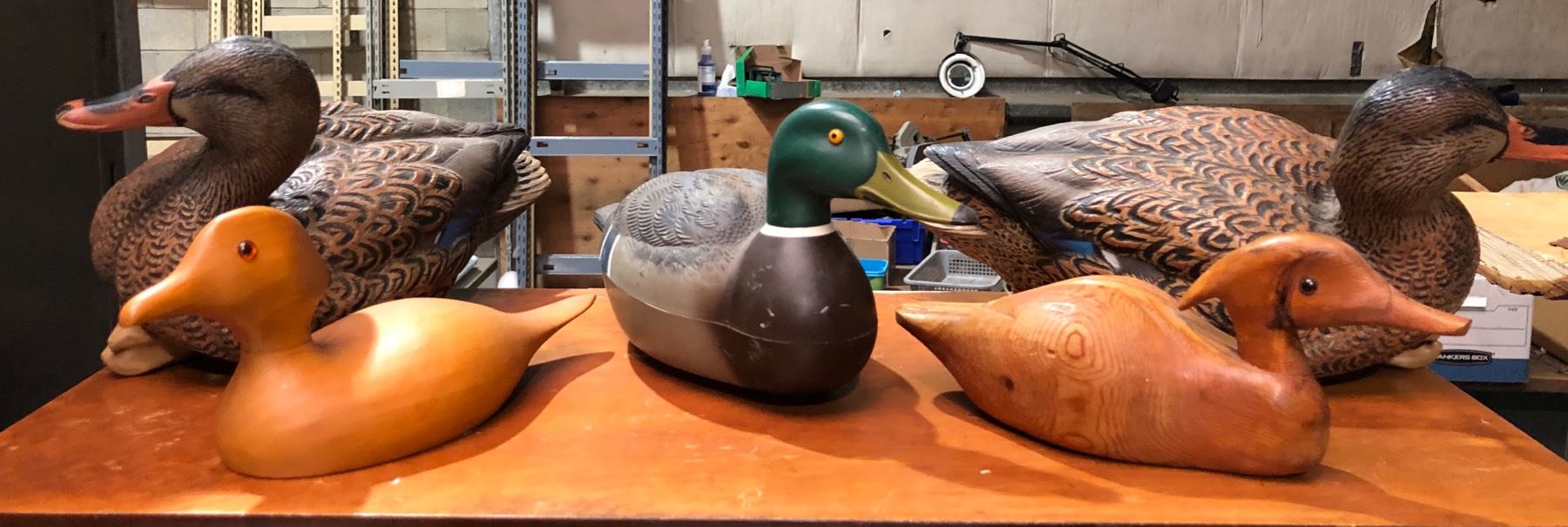 Two wood carved decorative ducks & 3 rubber duck decoys from the love show
