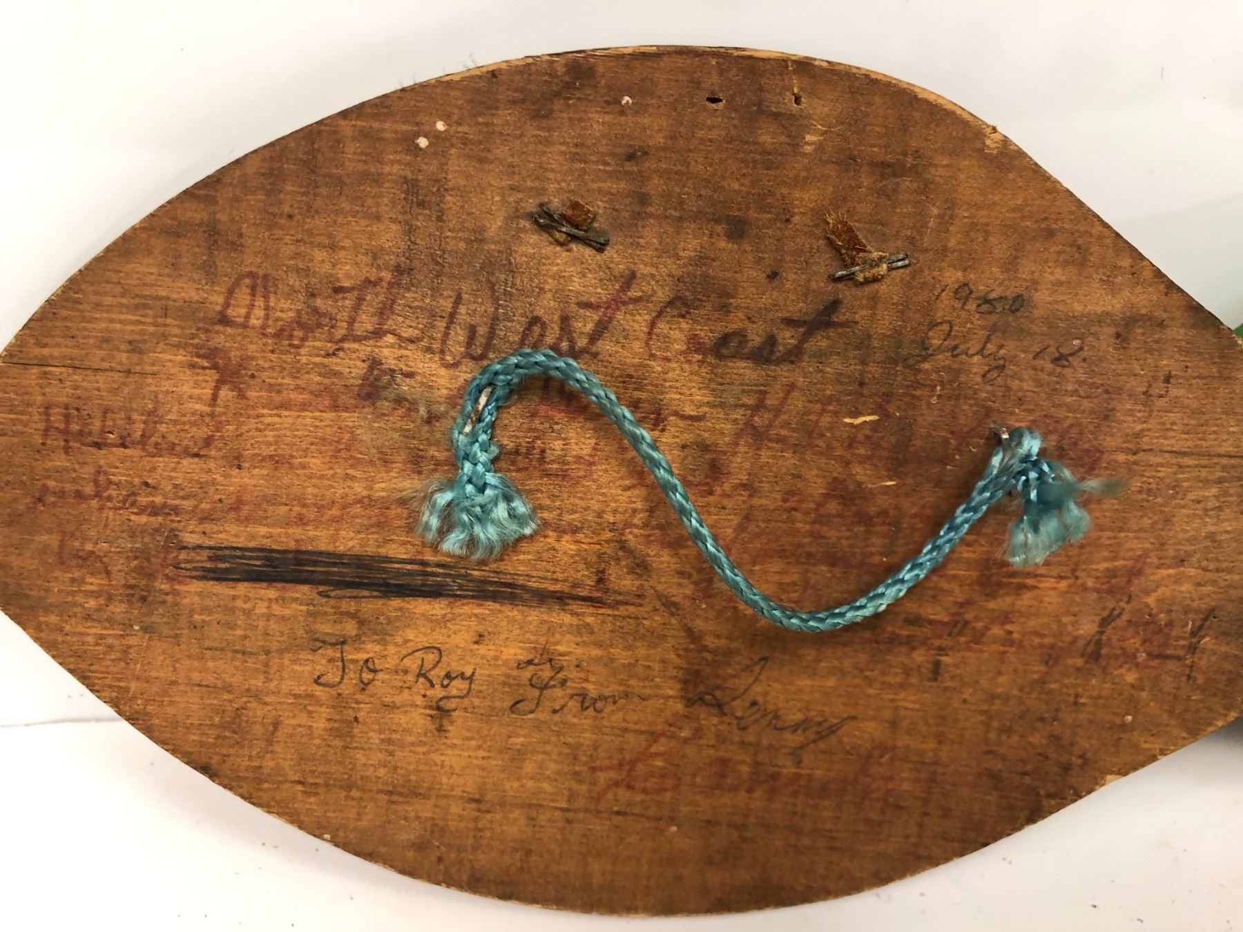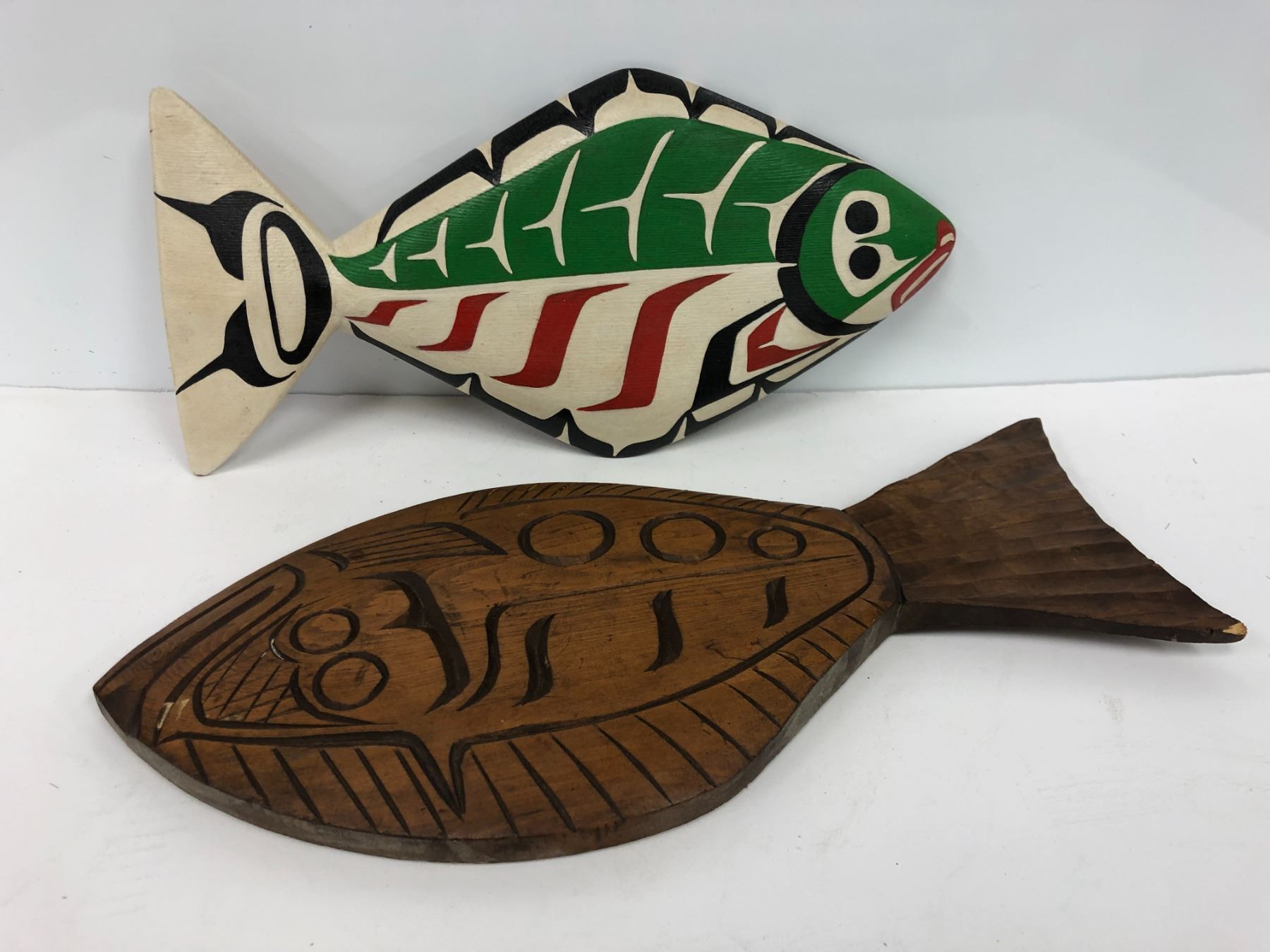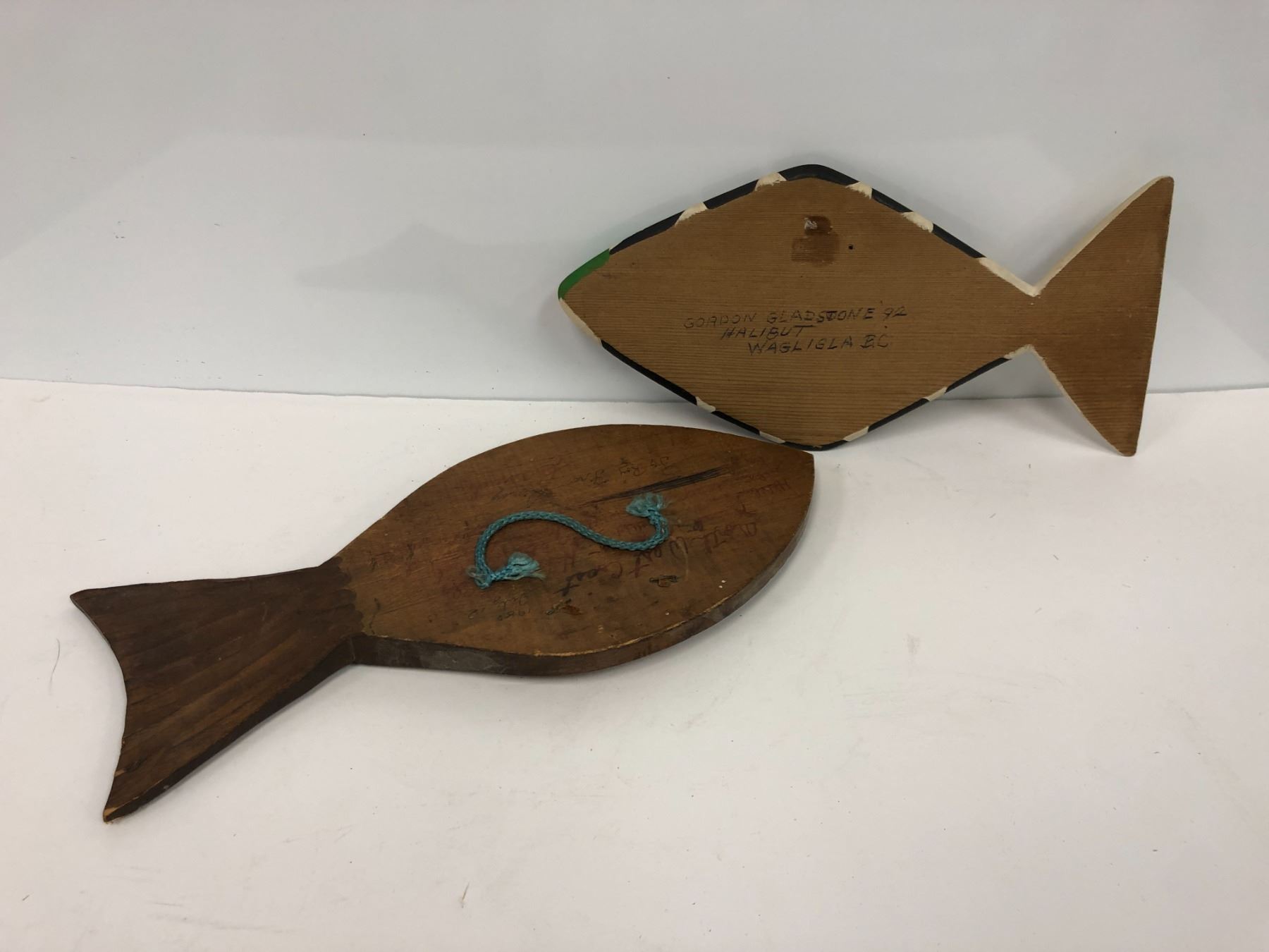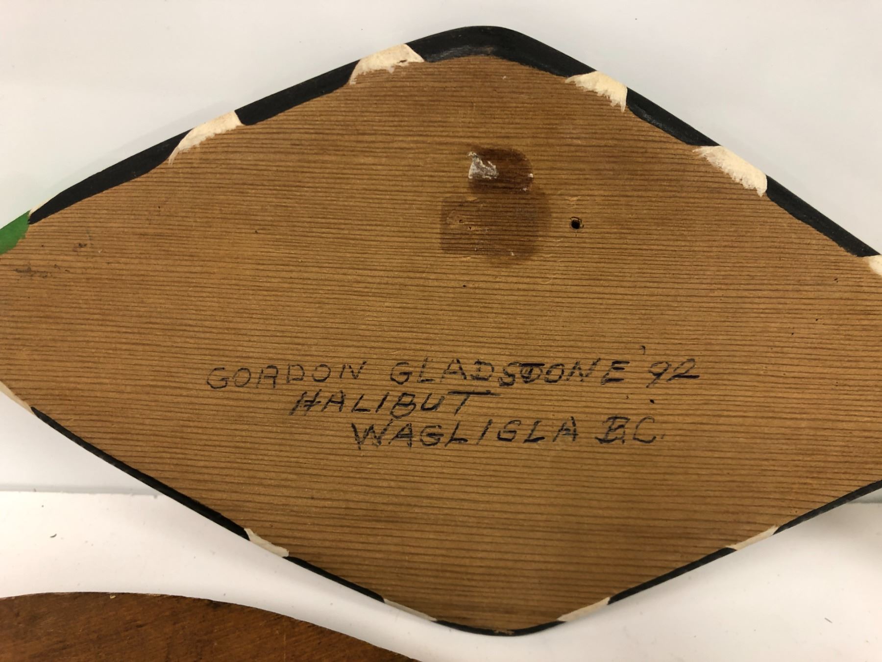 Two wooden halibut wood carvings - Gordon Gladstone 1992/ second carving's writing illegible - approx. 12in x 5 1/2in & approx. 11in x 5 1/2in