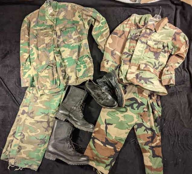 Two woodland camouflage American jackets and pants and size 10.5 boots and size 9 booths