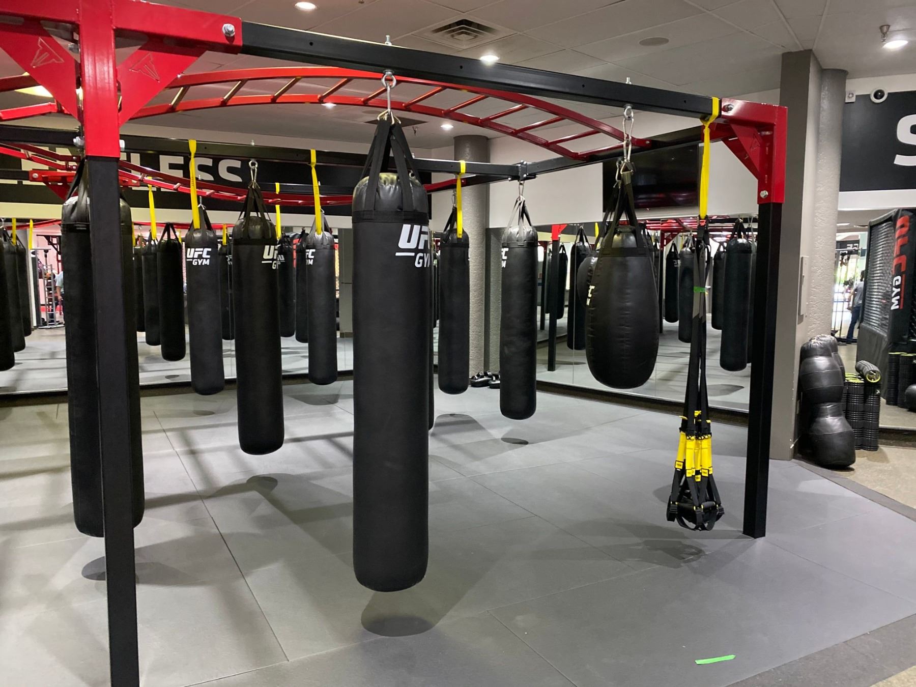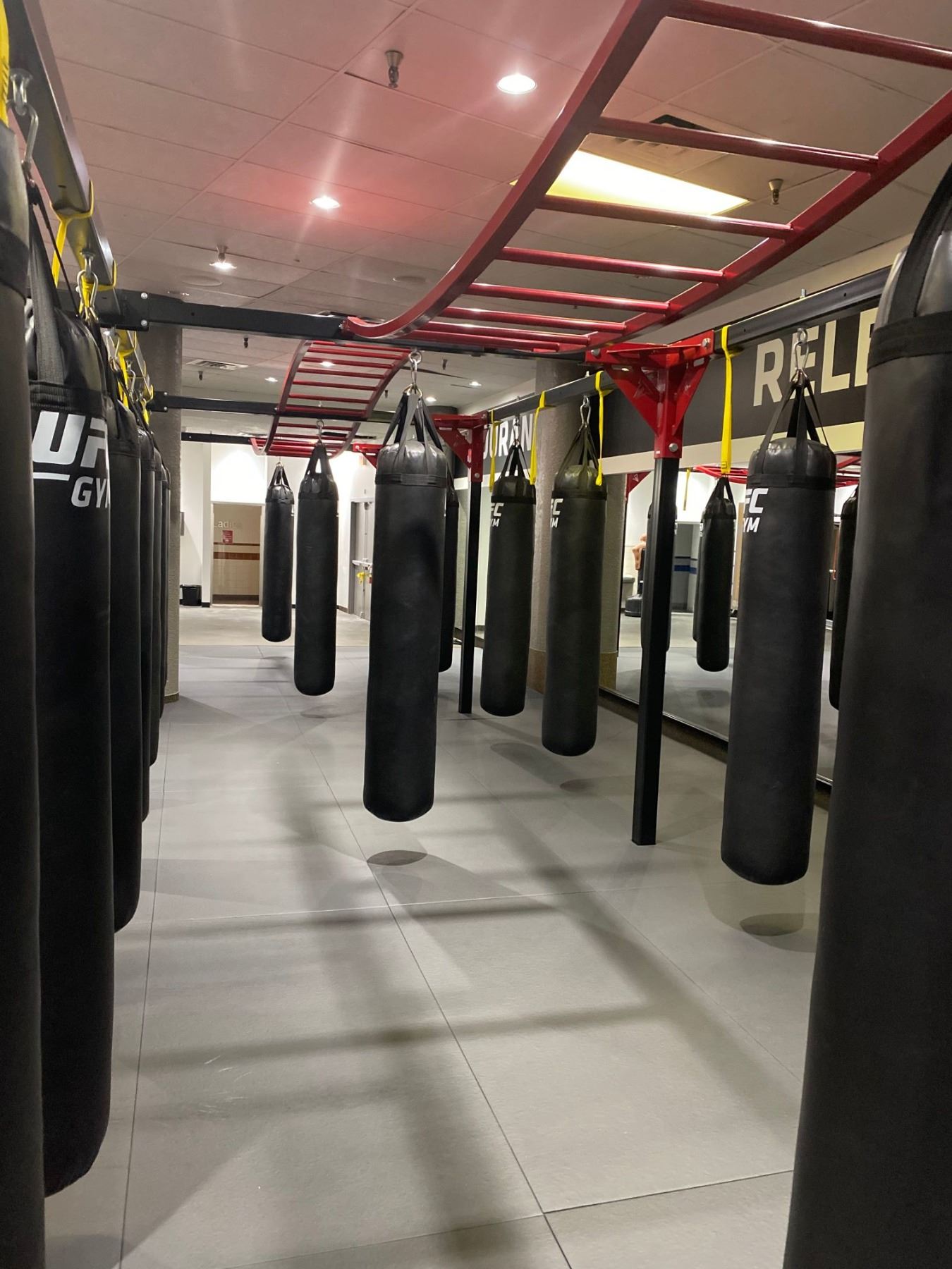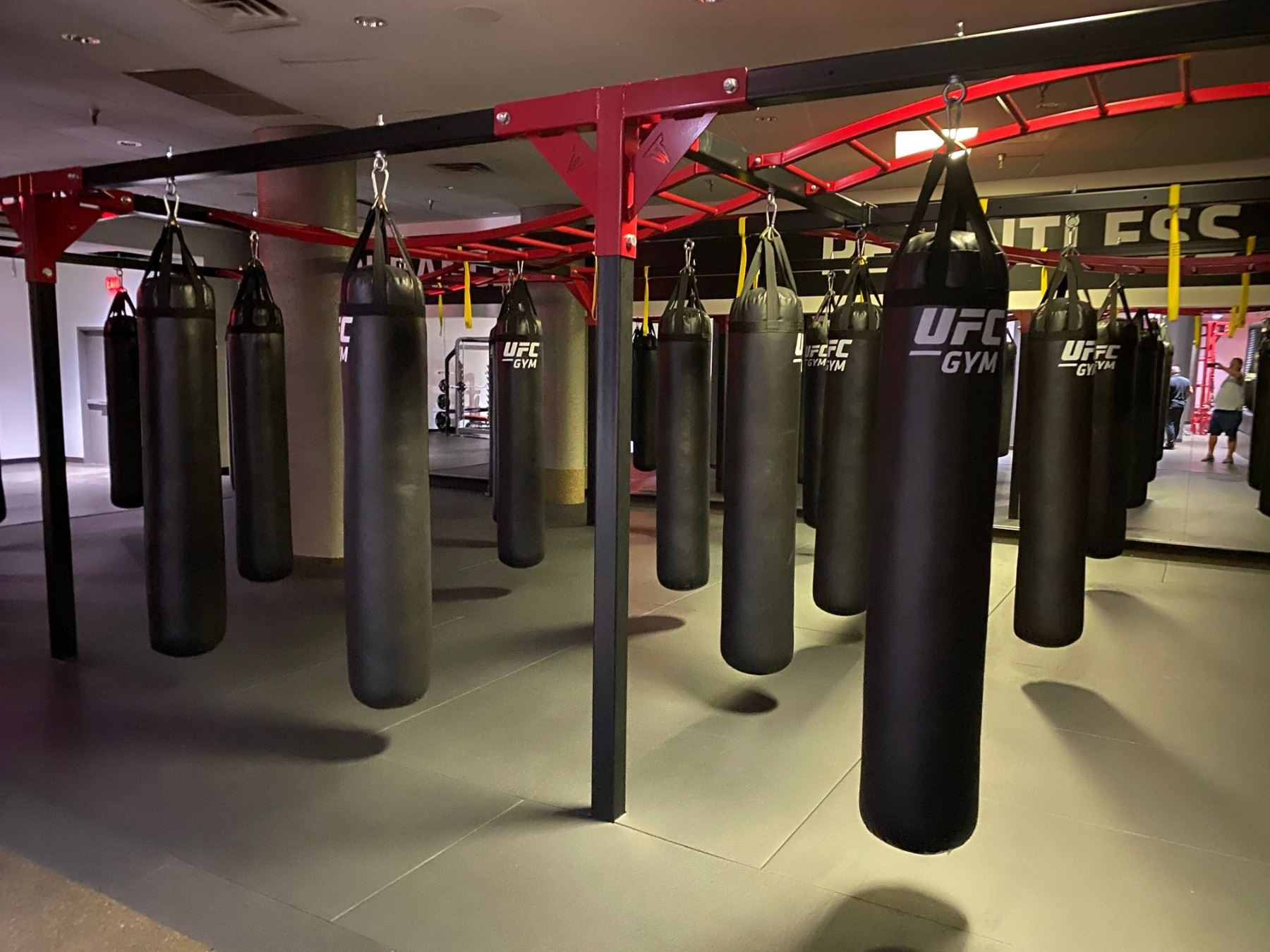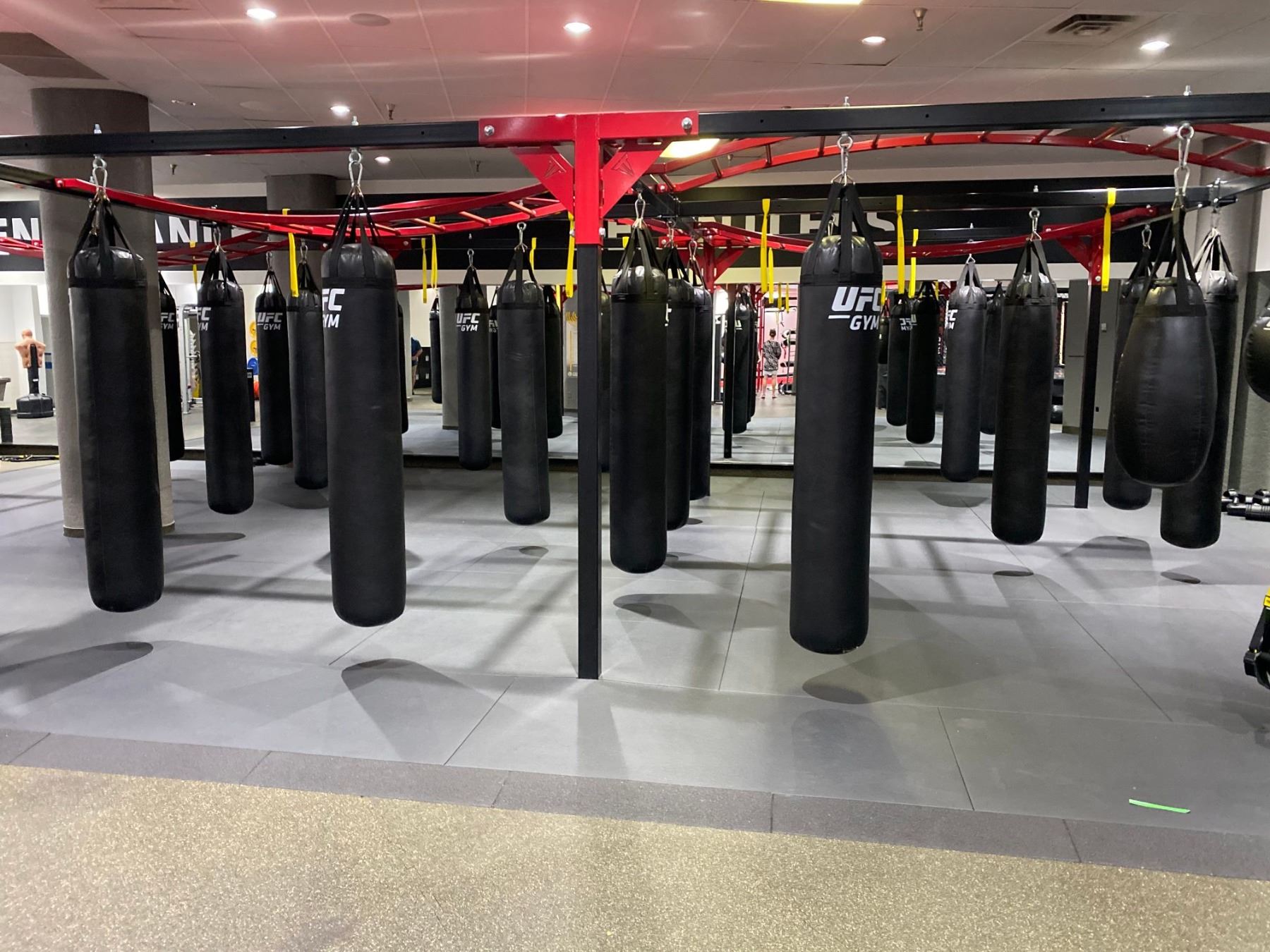 UFC BAG RACK, APPROX. 20' X 60' WITH OVER 30 BAGS, LADDERS AND PADDING