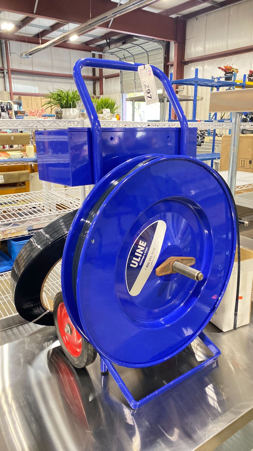 ULINE BLUE COMMERCIAL MOBILE BANDING CART WITH PLASTIC BANDING, CLIPS, & ASSORTED TOOLING