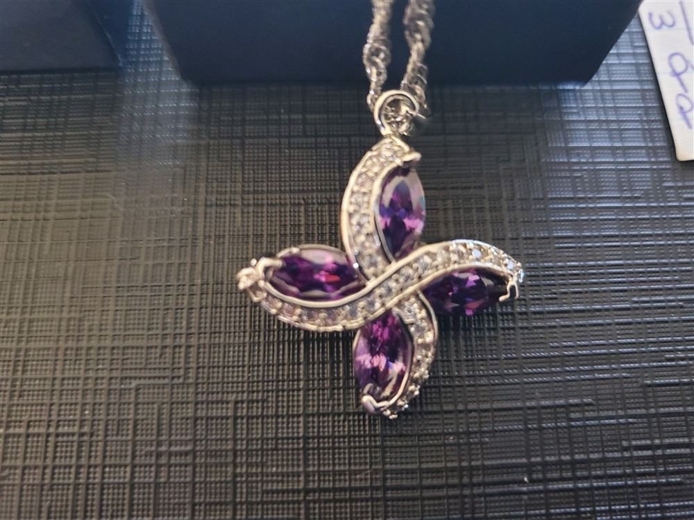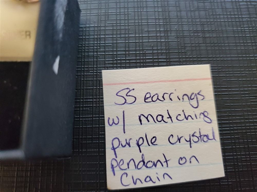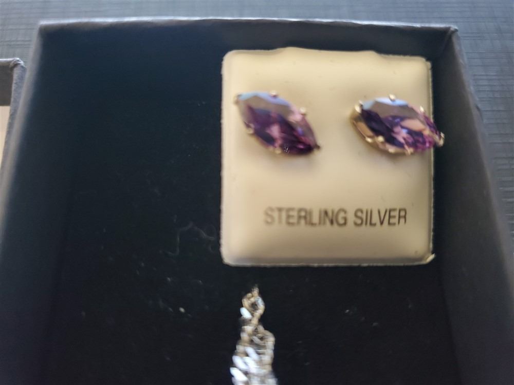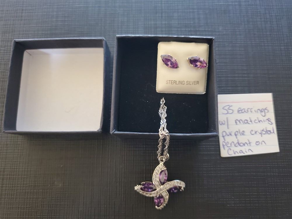 Sterling silver earrings with matching purple crystal pendant on chain - Most Items have not been tested - Viewing Recommended- 17% Buyer Fee. Payment Processed through Live Auction World ( Visa or Master Card ) pick up Wednesday