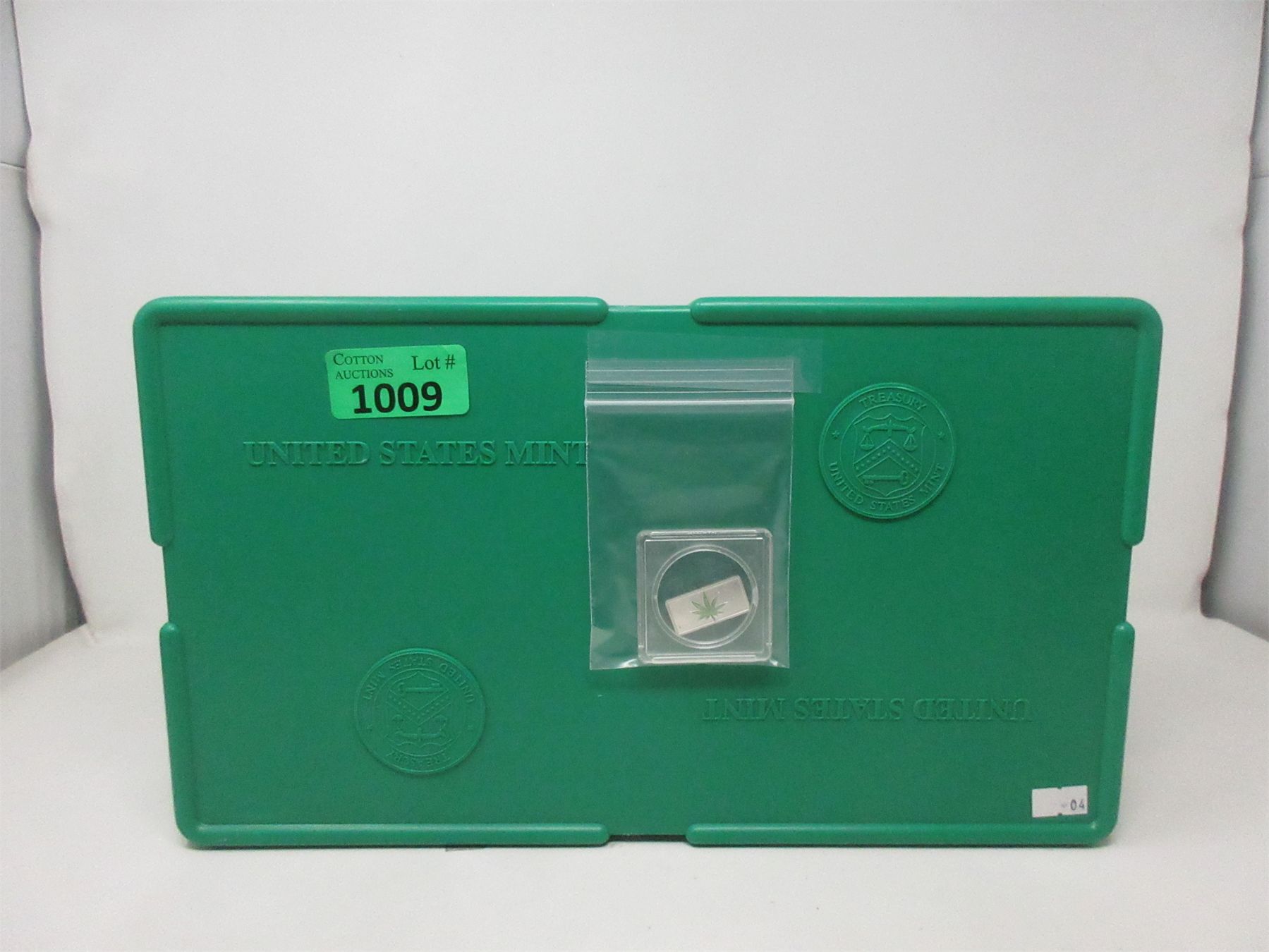 .999 Fine Silver Bar has a coloured Marijuana Leaf on the front. Green Bullion box measures 8" x 14" x 4.5" deep and has an interior tray.